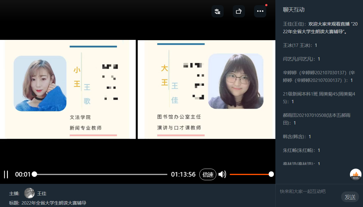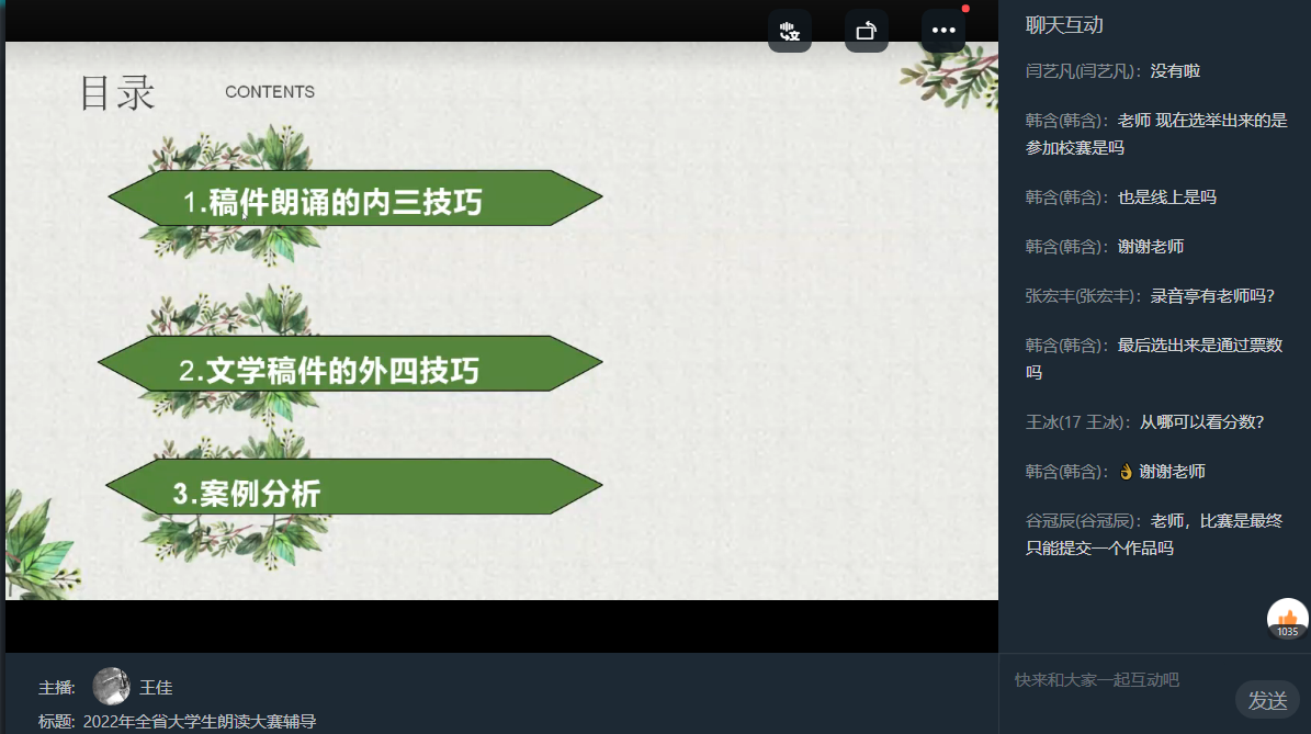 活动初期,图书馆、文法学院精心组织校内初赛,各学院积极动员学生参赛,演讲与口才课程任课老师以课程作业形式指导学生通过录制作品表达心声,王佳、王歌老师通过钉钉直播为参赛学生做专题指导讲座。