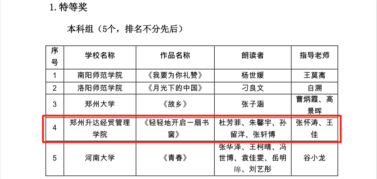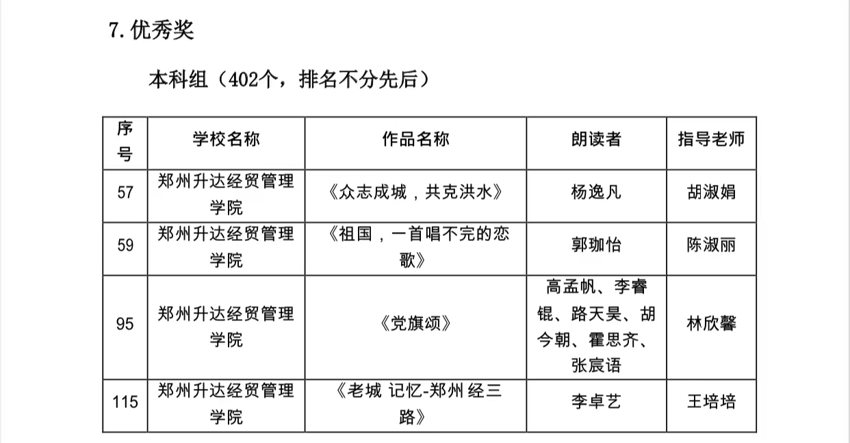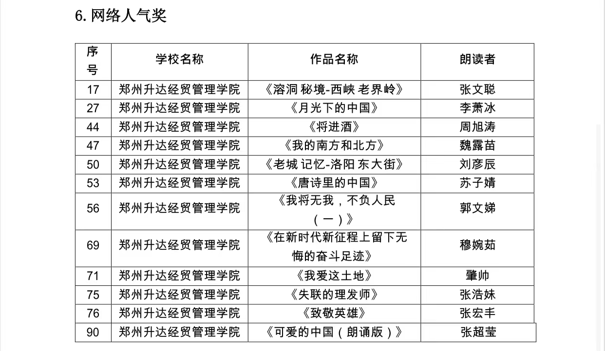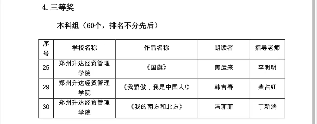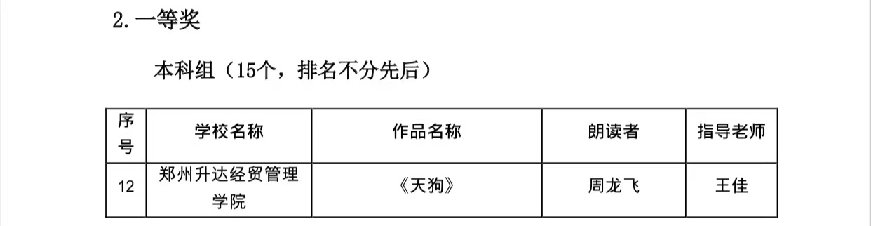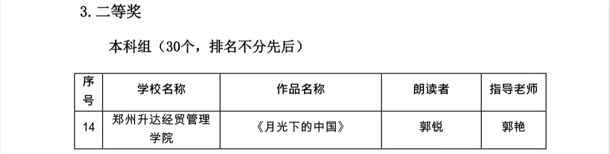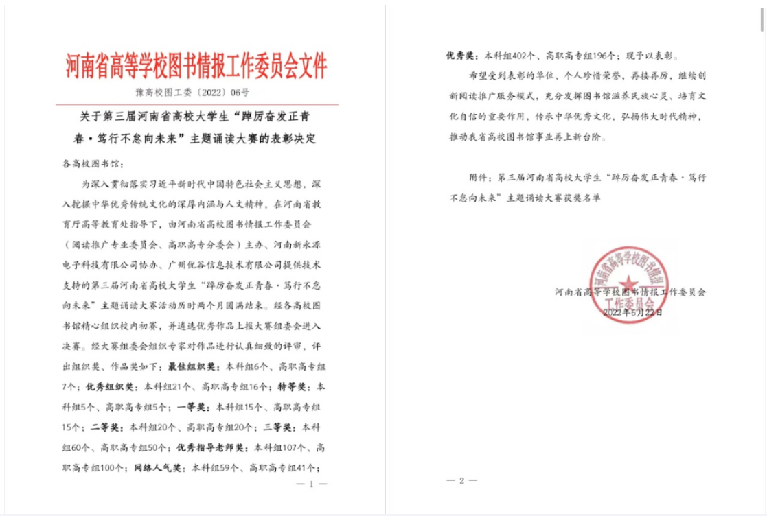 6月22日,由河南省教育厅高等教育处指导、河南省高等学校图书情报工作委员会主办的第三届河南高校大学生“踔厉奋发正青春·笃行不怠向未来”主题诵读大赛圆满落幕并公布表彰决定。活动于4月开启,我校共有七千余件作品参赛,历经初赛、校内评选、省级决赛几个阶段的评比,最终取得优异成绩。