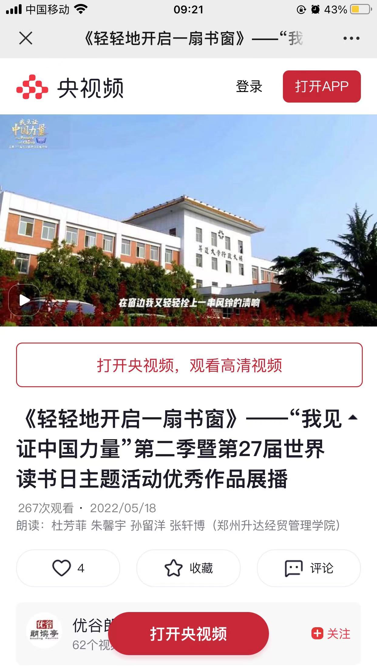 特别值得一提的是,张怀涛老师的原创作品《轻轻地开启一扇书窗》,由王佳老师指导校广播站的同学进行朗诵,并制作视频,作为“4.23世界读书日”特别作品,被央视频平台选中并播出,这也是河南高校中唯一获央视频平台展播的作品。