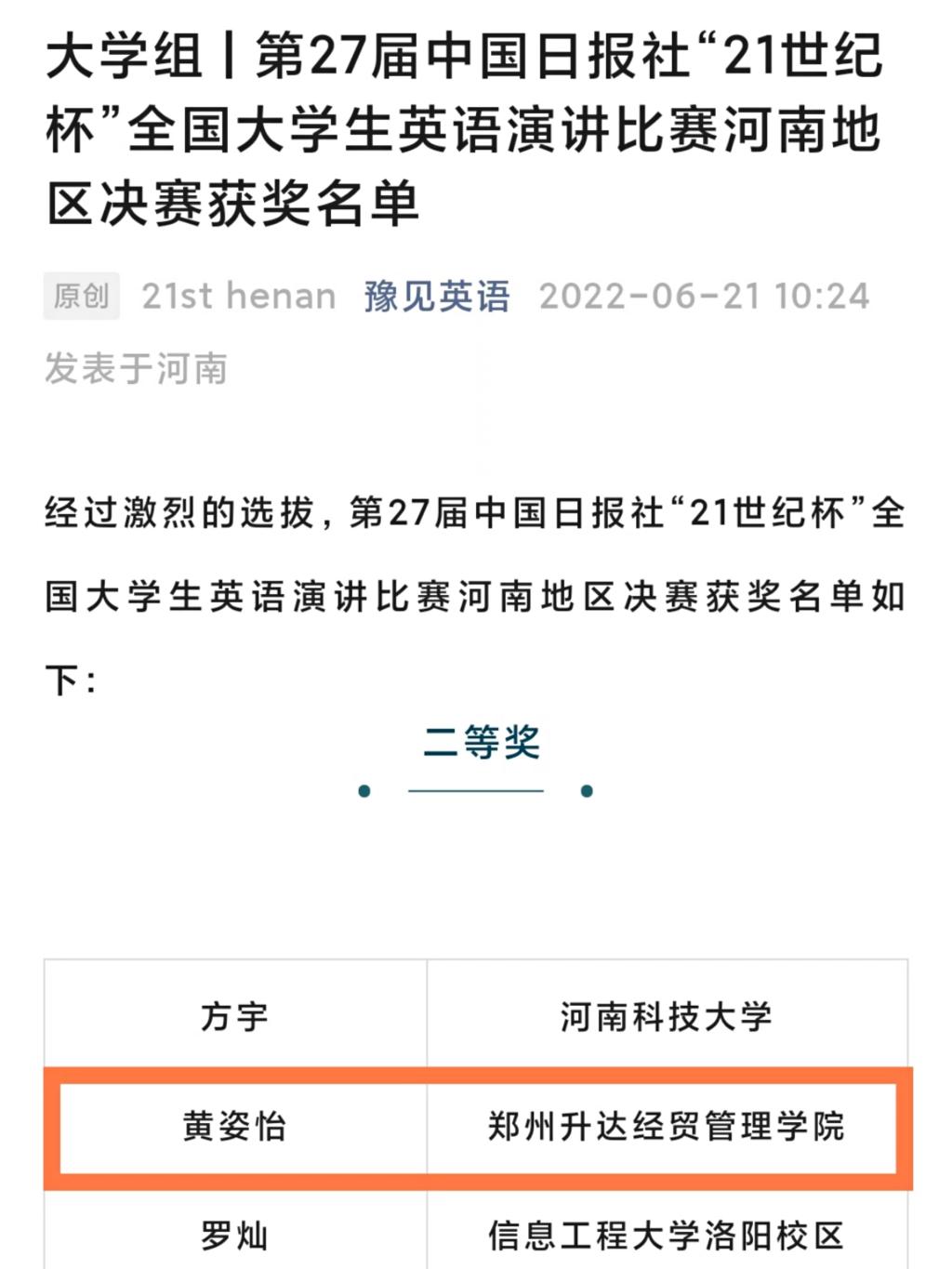 6月18日,中国日报社“21世纪杯”全国英语演讲比赛(河南赛区)如期在线上举行,本次比赛分为定题演讲,即兴演讲、现场问答三个环节。我校外国语学院翻译教研室李笑寒老师指导的2020级翻译专业学生黄姿怡经过初赛、复赛、决赛环节,根据中外专家评审结果,荣获个人二等奖。