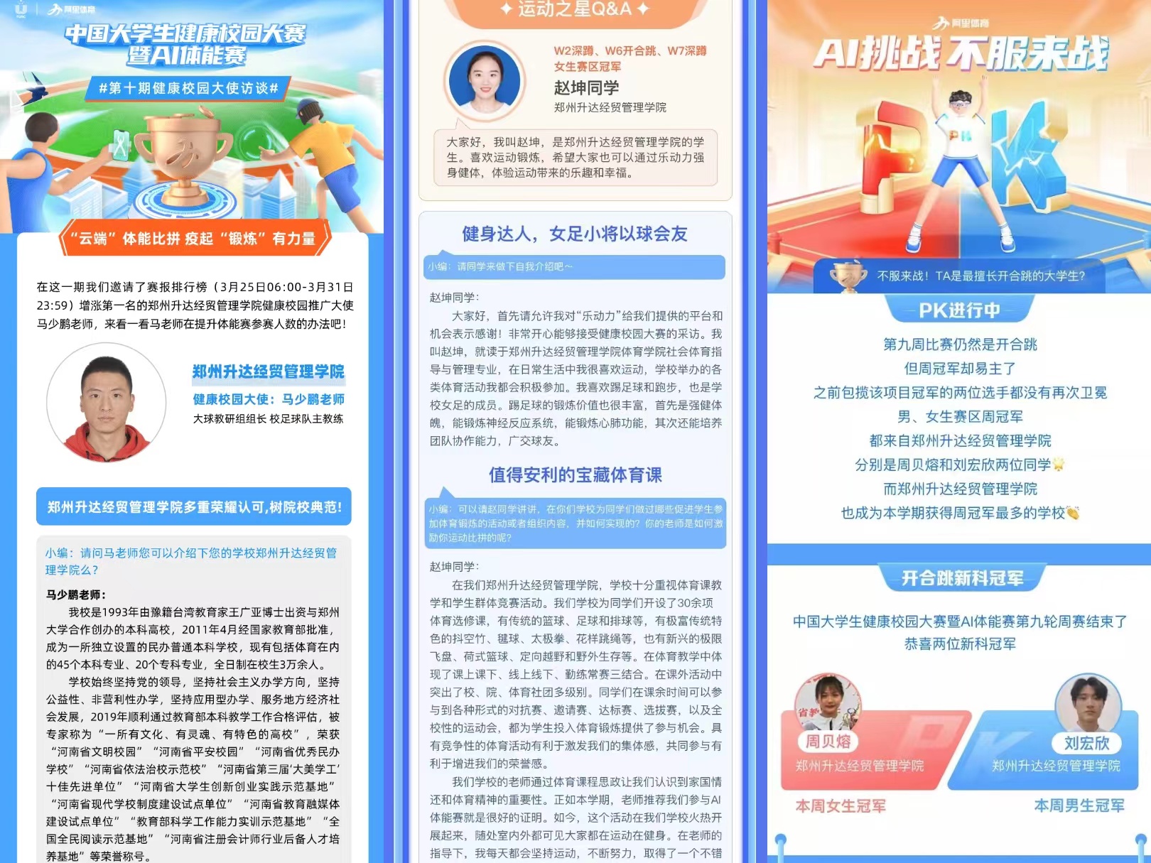 本次比赛于2021年12月13日-2022年6月5日分两个阶段在全国展开。比赛共设置深蹲、开合跳、下蹲开合跳、高抬腿、波比跳等5个比赛项目。在学校领导的大力支持下,在体育学院的精心组织和各学院的积极配合下,全校共有9000余名学生参赛,累计参赛18万余人次。体育学院马少鹏老师作为我校“健康校园大使”,带领赵坤、张鸽鸽、蔡文静、周贝熔等同学积极参赛,先后荣获7次周冠军和1次月冠军,最终包揽全国女子赛区前四名。