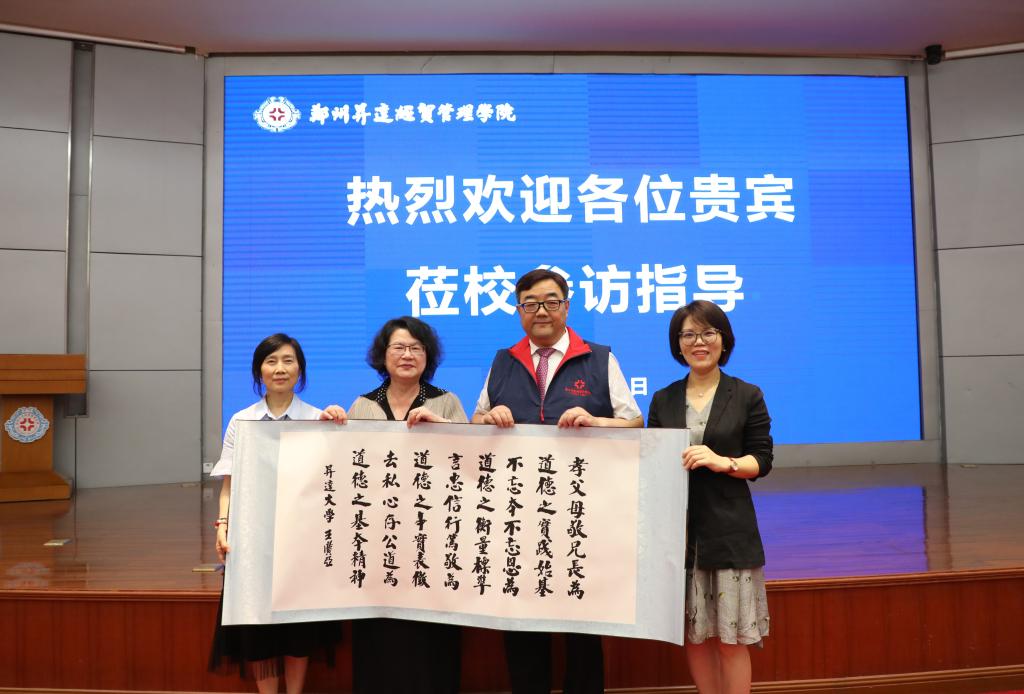7月6日下午,台湾地区桃园市创意文化教育协会、环球学习知能教育协会理事长李丽花、副理事长于英君,郑州台湾同胞投资企业协会常务副会长詹丽珠,新郑市教育园区管委会招商局局长张春旺等来我校参访交流,交流座谈会在我校国际会议厅举行。学校执行董事王新奇,校长、校党委副书记张欣,校党委副书记、副校长、工会主席张金安,校党委委员、副校长兼总务长张其武,董事会办公室、校长办公室、发展规划处、教学质量监测与评估中心、国际交流处等相关部门负责人参加座谈。会议由张欣主持。