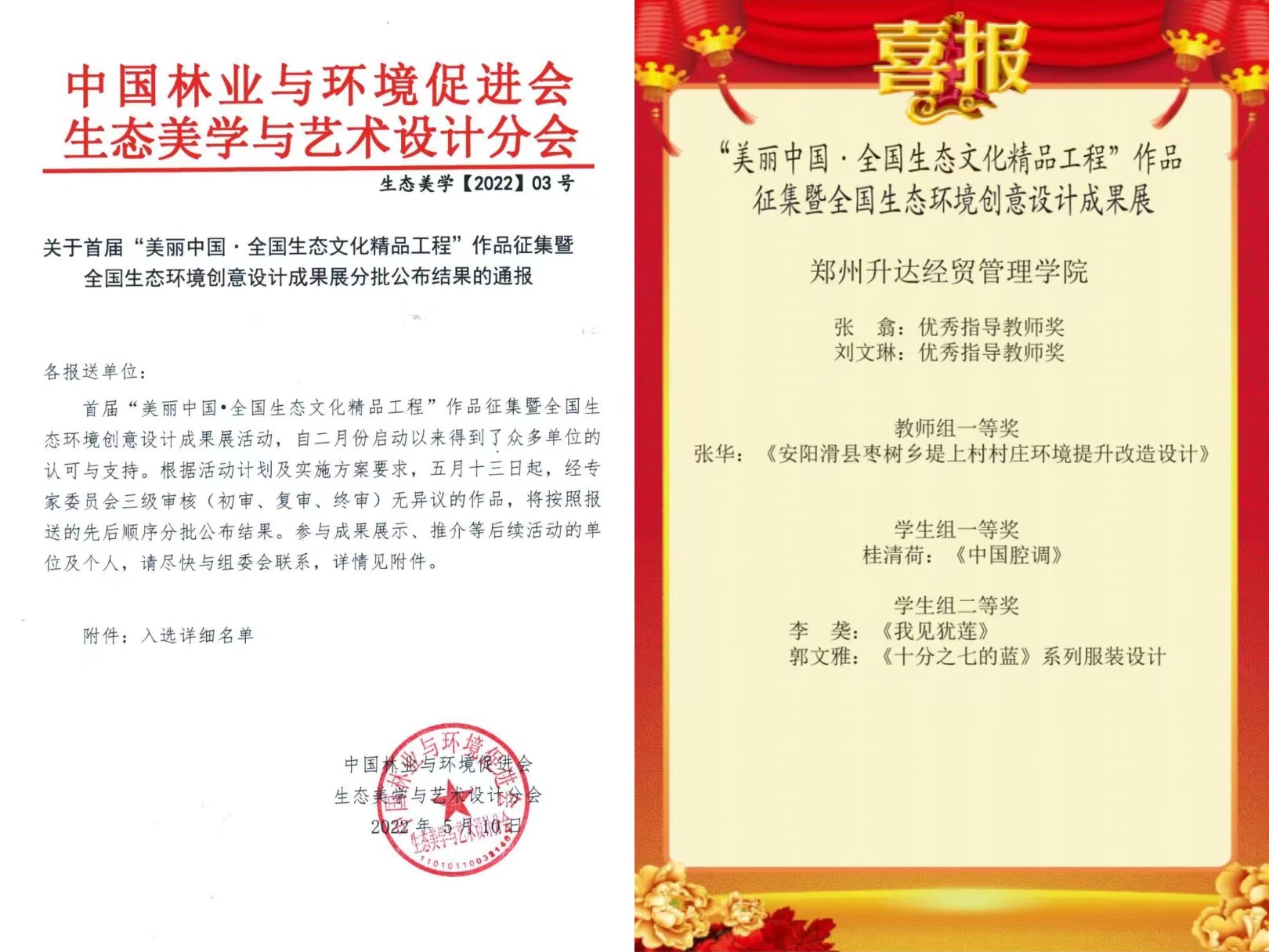 “美丽中国·全国生态文化精品工程”作品征集暨全国生态环境创意设计成果展,是由林业与环境促进会生态美学与艺术设计分会主办的竞赛。学院共遴选8件设计作品,通过国家级专家审核委员会初审、复审、和终审三级审核后,最终收获优异成绩。精选作品将分类收录进全国生态文化精品工程系列丛书和全国生态文化精品工程影像资料库,公开出版、全国发行,并进行线上和线上巡展。