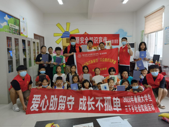 在新乡市封丘县,2020级环境设计专业同学以“喜迎二十大、永远跟党走、奋进新征程”为主题成立了“新希望关爱团”实践团队。7月22日至23日,辅导员魏双双老师带领邵飞阳、齐萌萌、温淇、高嘉璐、谢京宸等“新希望关爱团”成员在李庄镇临河小区留守儿童之家开展了关爱留守儿童活动。“新希望关爱团”成员首先结合具体案例和少年儿童认知特点,就防溺水、防暴雨洪涝、防高温中暑以及日常的防火防电、交通安全、疫情防控等开展了生动的宣讲,随后带领小朋友们做游戏、学唱歌、练手势操。团队成员还向孩子们赠送了文具、水果、牛奶等礼物,分享了大学生活,鼓励孩子们努力学习,长大后报效祖国。