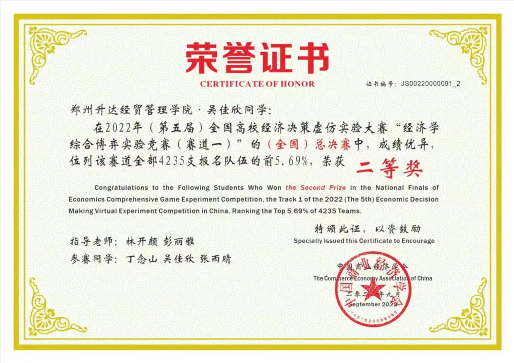 2022年9月11日,2022年全国高校经济学综合博弈实验大赛总决赛通过线上形式盛大举行。前期经过积分赛、区域赛等多轮角逐,在4235个参赛队伍中最终由来自157所学校的482支团队成功晋级本次总决赛。我校金融贸易学院学生丁念山、吴佳欣、张雨晴、杜思佳、吴一帆、赵晓阳组成的两支参赛队伍在我院两位教师林开颜、彭丽雅的指导下参加了此次比赛,经过激烈的角逐,我院两支代表队均获得了二等奖的好成绩。