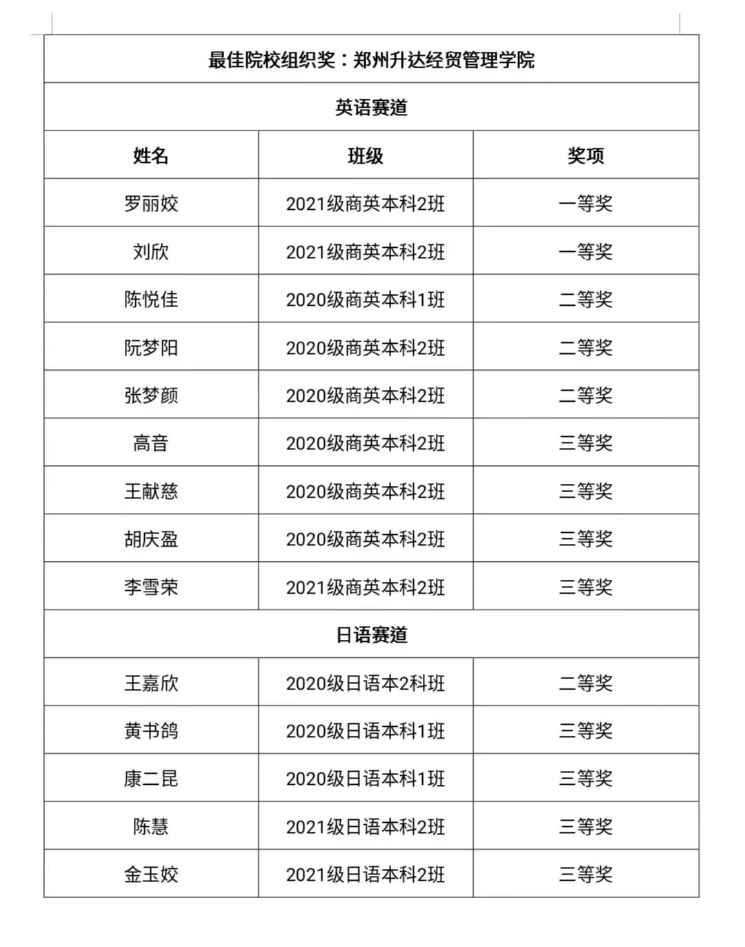 本次大赛参赛学校众多,英语赛道吸引了来自全国240余所高校的6.3万余学生报名,日语赛道共有来自全国160余所高校的8千余名学生报名参赛,我校200余名学子报名参加此次大赛。大赛采用线上比赛的形式进行,分为英语赛道和日语赛道角逐比拼。英语赛道共有9名同学获奖:2021级商务英语本科2班的罗丽姣、刘欣同学喜获一等奖,2020级商务英语本科专业的陈悦佳、张梦颜、阮梦阳同学喜获二等奖,2020级商务英语本科专业的高音、王献慈、胡庆盈及2021级商务英语本科专业的李雪荣同学喜获三等奖。日语赛道共有5名同学获奖:2020级日语本科2班的王嘉欣同学喜获二等奖,2020级日语本科1班的黄书鸽、康二昆以及2021级日语本科2班的陈慧、金玉姣喜获三等奖。