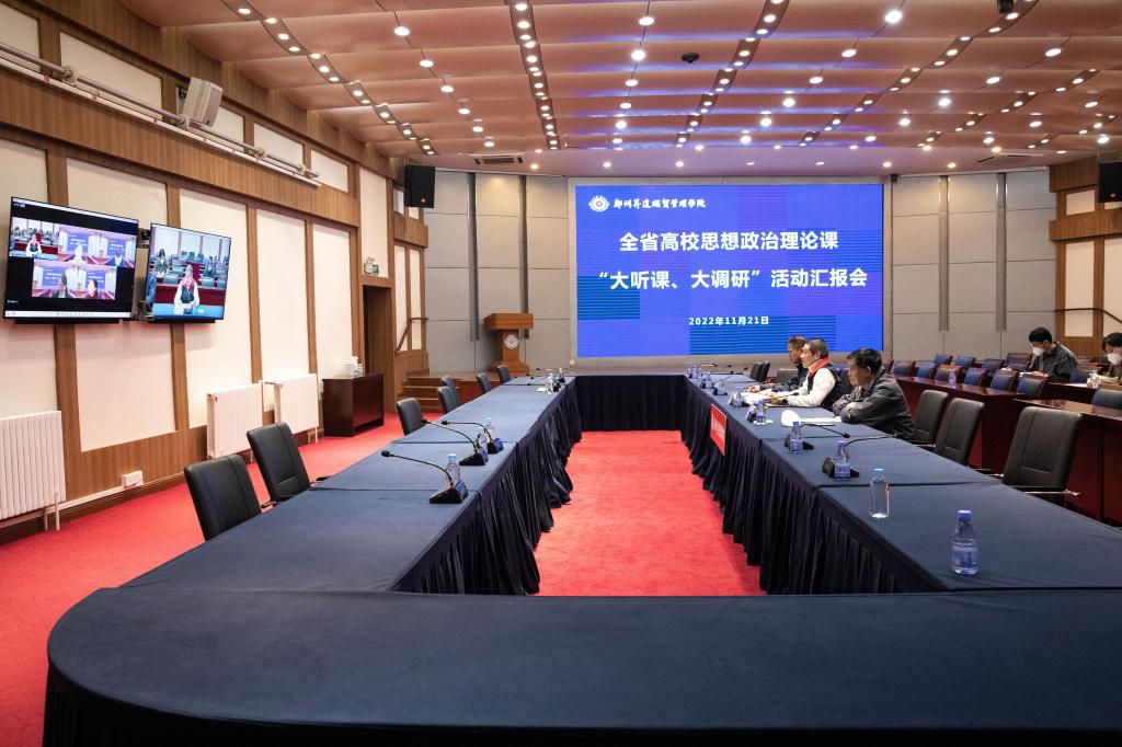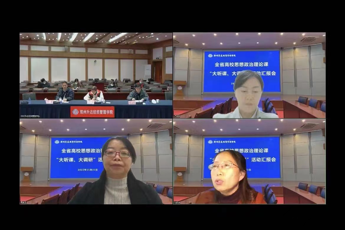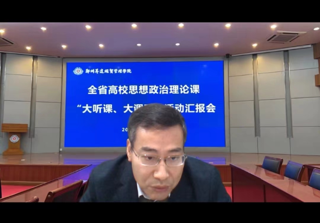 为深入贯彻习近平总书记在中国人民大学考察时的重要讲话精神,认真落实教育部近期工作推进会的相关部署,贯彻落实近期省委常委会会议精神和省委宣传部等三部门相关文件精神,11月21日,由新乡医学院马院院长戎华刚为组长的全省思政课秋季学期“大听课”“大调研”第十四组,通过云端对我校思想政治理论课建设情况进行指导。校党委书记雷霆、副校长吴益民、马院院长王宪政、马院党总支书记窦峰及思政课教师代表参加汇报会。