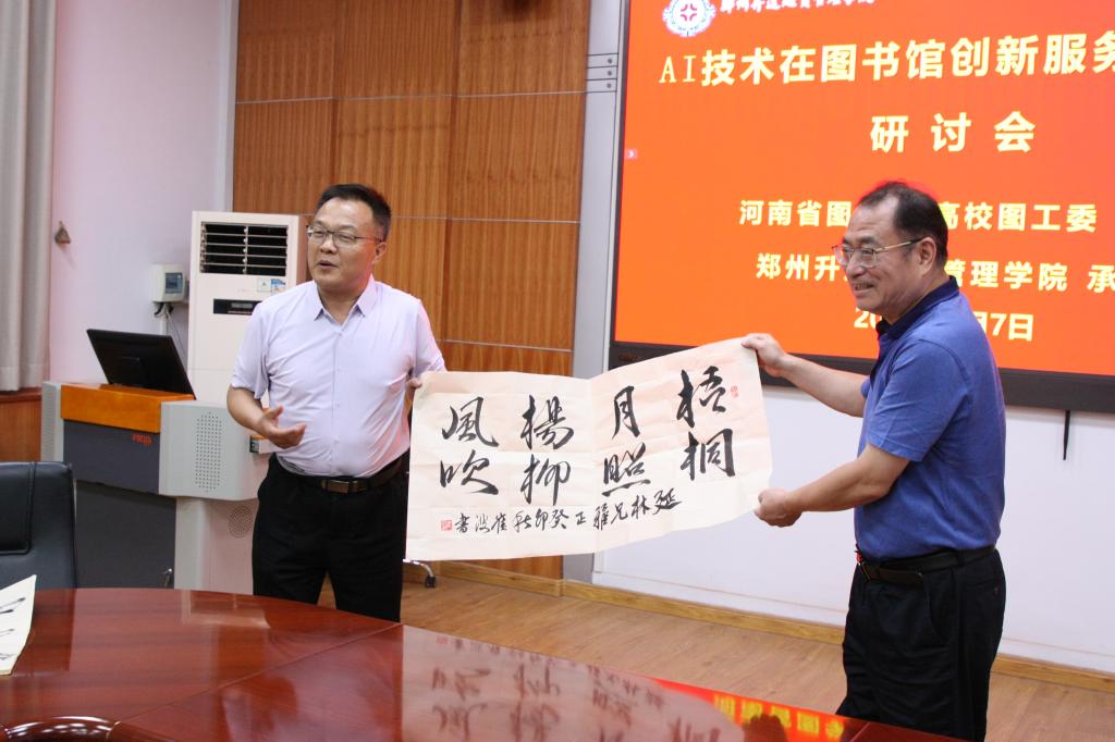 崔波教授进行了总结发言。他强调,我们要以包容、开放、进步的心态欢迎科技公司跨界进行图书馆专业技术的研究,在学习和利用新技术的同时继承传统和经典,让新技术能够充分服务于图书馆,服务于读者。最后,他把自己亲笔书写的书法“梧桐月照,杨柳风吹”赠送给我校图书馆。