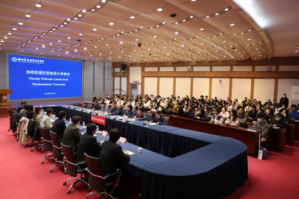 1月5日下午,泰国巴吞他尼大学副校长尼缇玛·茵咏、副校长兼工商学院院长乌塔拉·蒙申一行8人莅校参访,双方在国际会议厅进行了合作交流项目的会谈。我校副校长张金安出席会议,教务处、国际交流处、外语学院、文法学院等相关部门主管及100余名学生及教师代表参会。