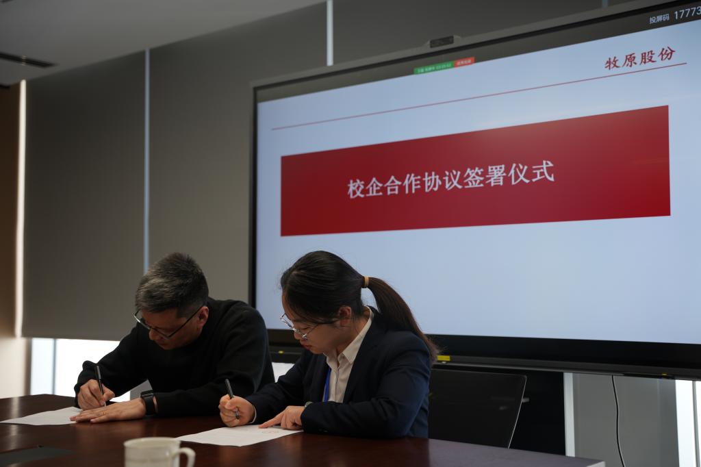 张金安一行走访调研了牧原发展历程展区、智能装备设施区、员工办公区等。座谈会中,张金安代表学校致辞,与会学校领导与牧原股份屠宰肉食事业部区域经理李世强、招聘负责人邹薇等事业部领导进行深入交流,并与牧原集团签订校企合作协议,举行了挂牌仪式。我校在职毕业生代表陈浩浩、王聪向学校汇报了在牧原的工作和生活情况。