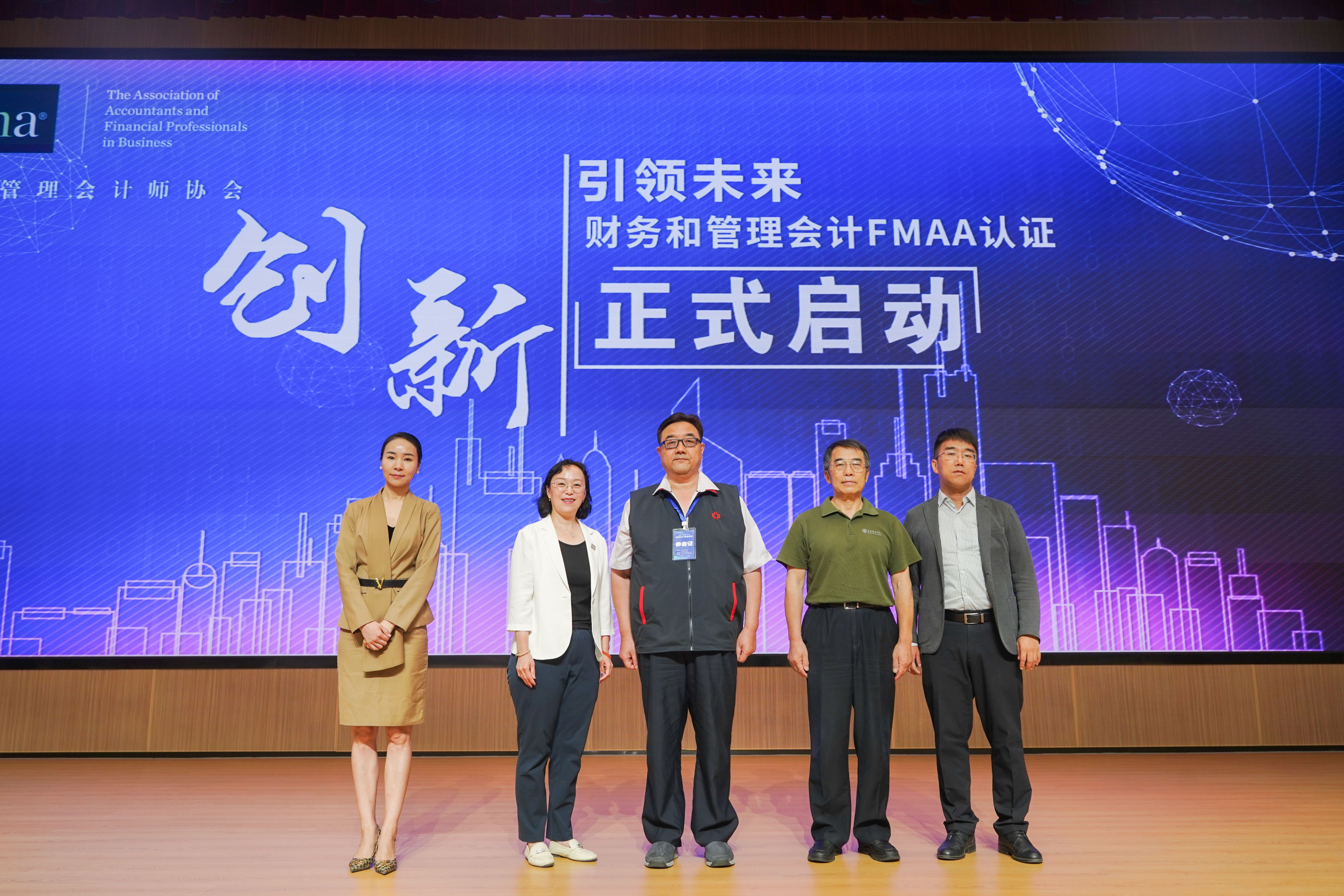 我校董事长王新奇博士、IMA管理会计师协会合作与发展总监周靓、北京大学光华管理学院王立彦教授、天津商业大学会计学院院长白默教授和河南中赢教育科技集团公司董事长王莹玉共同启动了IMA管理会计师协会FMAA资格证书认证发布仪式。