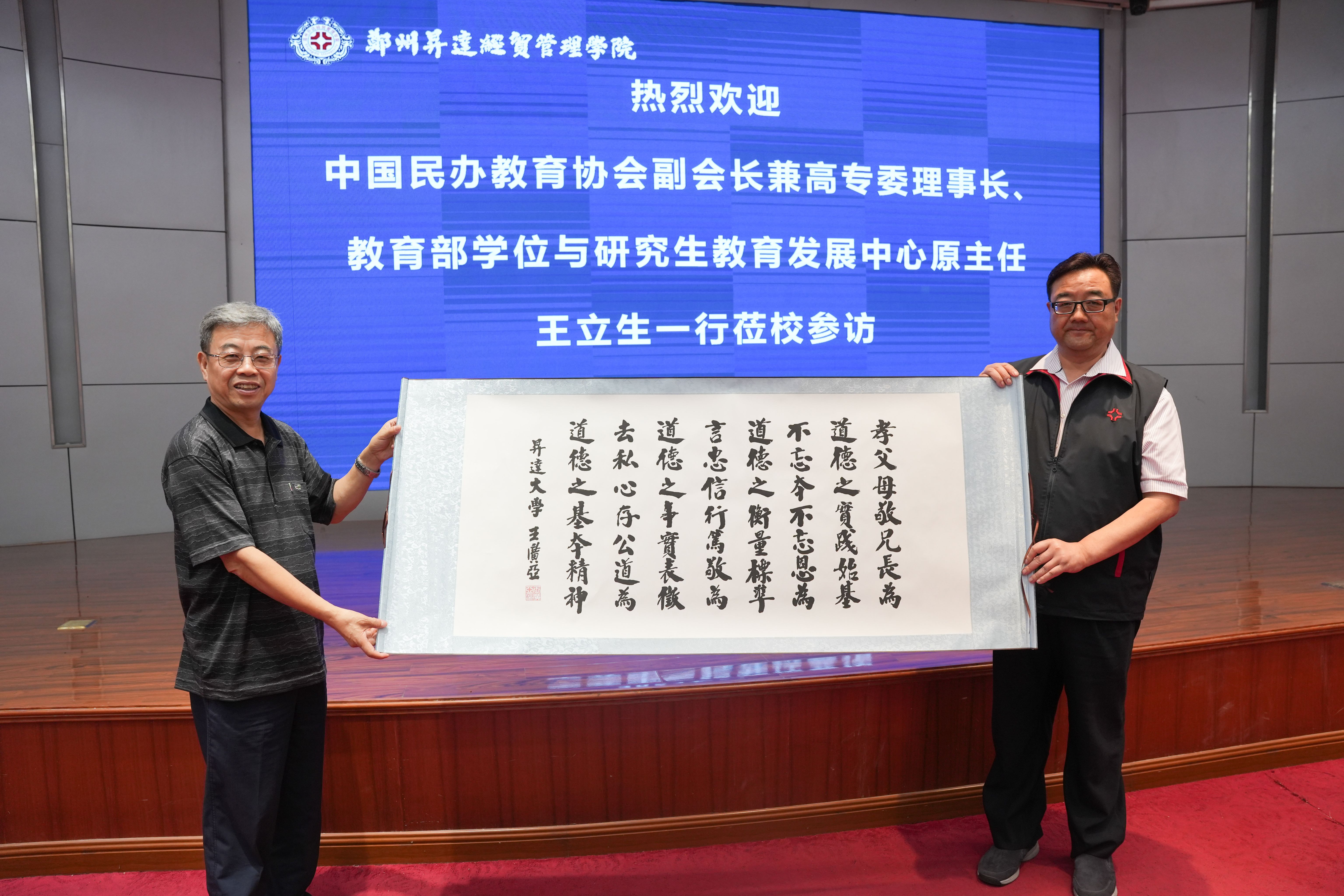 王立生对学校的热情接待表示感谢,他对学校先进办学理念、近年来办学成绩表示赞许,对创办人王广亚博士冲破重重阻力在河南办学,回馈桑梓、造福家乡的举动表示感动。他指出,近年来民办教育事业快速发展,在扩展教育资源、丰富教育类型、推动教育高质量发展、满足人民群众多样化教育需求等方面,作出了不可替代的重要贡献。作为民办高校要充分发挥作用,奋力书写教育强国建设,为全面推进中华民族伟大复兴提供有力支撑。