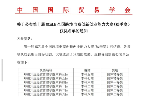 近日,由中国国际贸易学会主办的第十届OCALE全国跨境电商创新创业能力大赛(秋季赛)顺利举行,我校商学院2022级电子商务和跨境电商专业24名学生组成6支队伍参加了本次竞赛,经过三天的激烈比拼,在霍倩倩、白朋飞、常春燕、崔玉艳、刘玲芳、胡好好等9位教师的精心指导下,同学们奋勇拼搏,最终荣获特等奖2项、一等奖1项、二等奖6项、三等奖2项的好成绩。