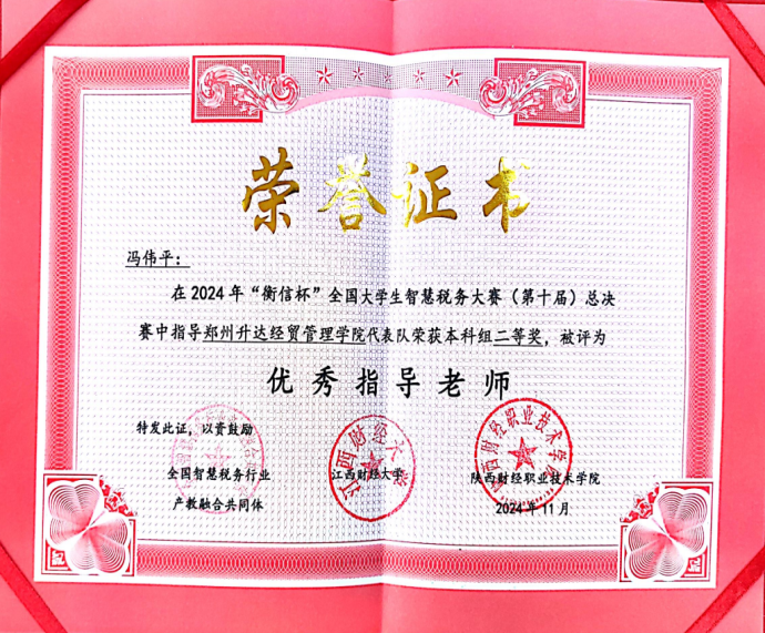 近日,第十届“衡信杯”全国大学生智慧税务大赛总决赛成功举办。共有来自全国145所院校的167支代表队501名财税精英学子参加总决赛。经过角逐,我校会计学院陈金茹、王燕柳、齐佳慧3位学生组成的代表队最终获二等奖,尚晓勇、冯伟平两位老师被评为优秀指导老师。