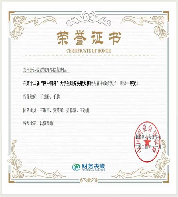 近日,由中国高等教育学会高等财经教育分会提供指导,中国商业会计学会主办的第十二届 “网中网杯” 大学生财务决策大赛全国总决赛在大理成功举办。大赛自10月启动以来,有近500所高校近千支代表队参赛,经过初赛、全国选拔赛的层层选拔,最终49支参赛代表队入围全国总决赛。我校会计学院2022级财务管理专业本科2班王淑雨、晏聪慧、王冰鑫、贺蒙萌四位同学在全国选拔赛中脱颖而出并顺利晋级,经过连续7个小时封闭式的激烈角逐,最终获得全国总决赛三等奖,指导老师安然、申皓获得“优秀指导教师”称号。