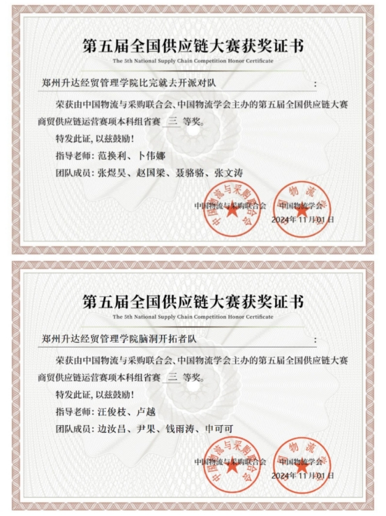 近日,由中国物流与采购联合会和中国物流学会主办的全国供应链大赛商贸供应链运营赛项在线上进行,我校商学院两支队伍荣获三等奖。