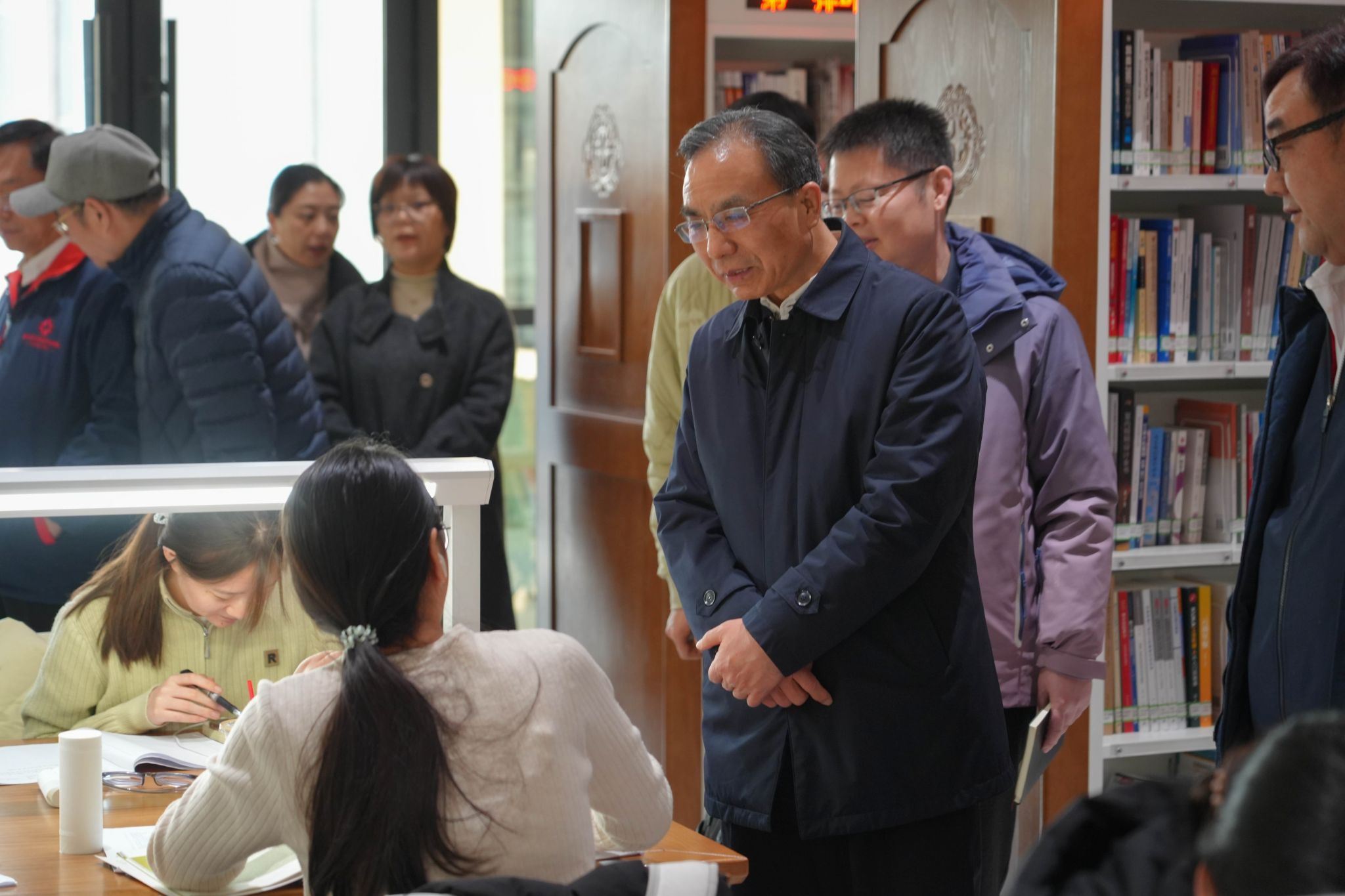 尹洪斌参观了新图书馆、三十周年成果展等处,向学生、相关负责人详细了解学校发展、校园建设、教育教学等情况。