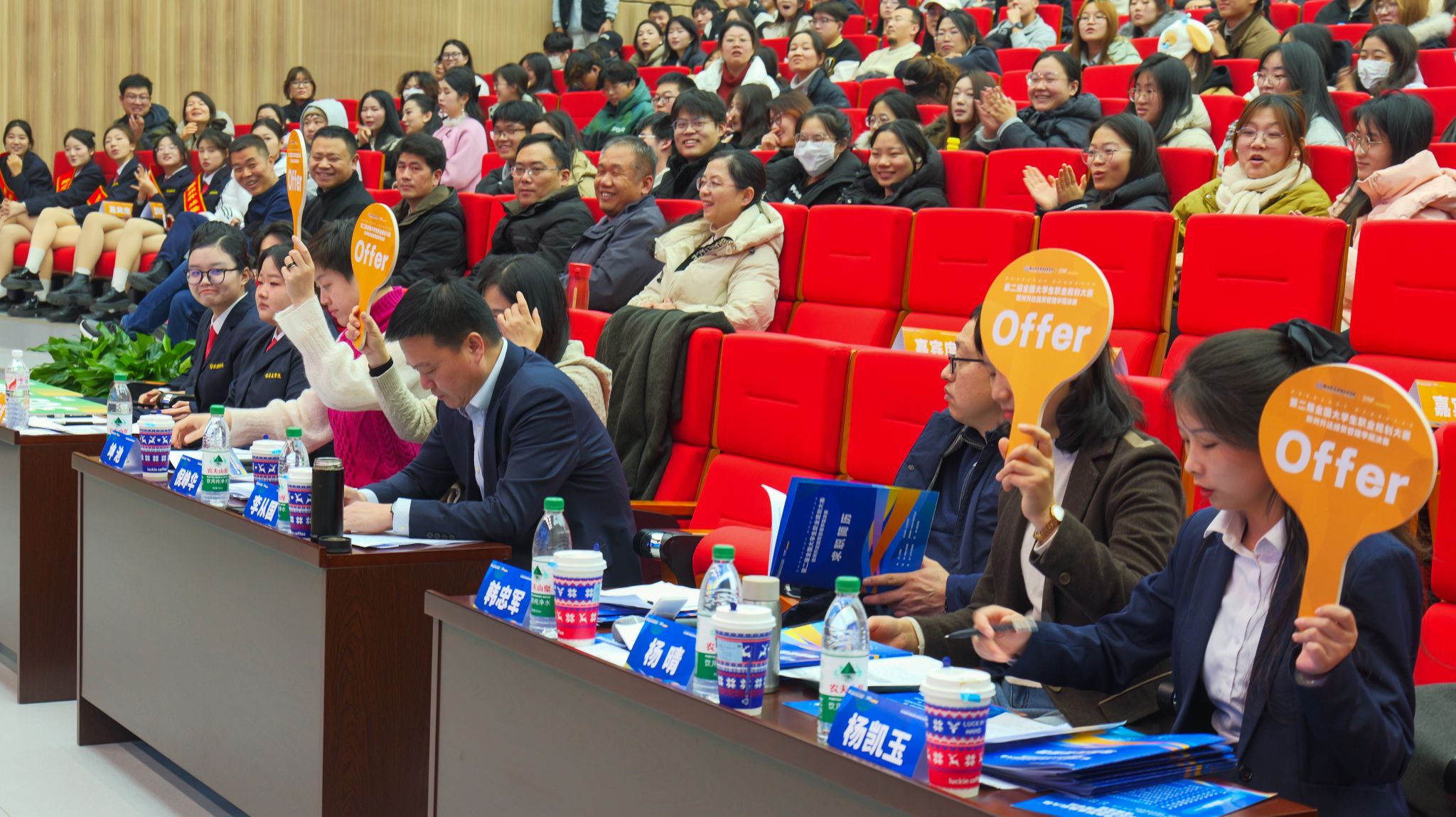 决赛现场,成长赛道的选手围绕职业目标的设定与规划、学习实践行动的具体落实以及应对变化的动态调整,进行了深入的主题陈述。就业赛道的选手则聚焦于职业目标的精准定位、岗位胜任力的深度分析及个人发展潜力的多维展示,以扎实的专业知识和丰富的实践经历,充分展现了自身的竞争力与职业所需能力的高契合度。参赛选手们准备充分,逻辑清晰、表达自信,充分展现了升达学子的职业素养、个人风采和积极向上的精神风貌。在提问环节,评委嘉宾以专业的视角、独到的见解,犀利的点评针对每一位选手的职业规划展开深入提问与交流,引得现场阵阵掌声。企业代表更是向表现优秀的选手亮出手中的offer手牌给予肯定。