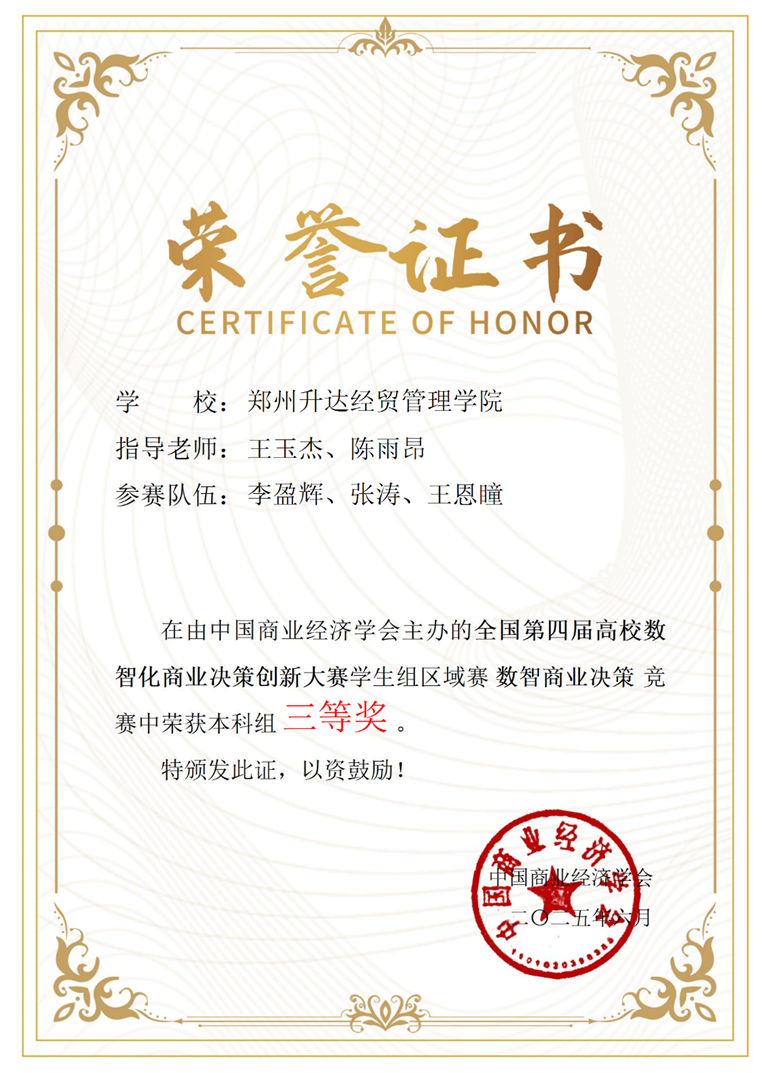 近日,由中国商业经济学会主办的全国第四届高校数智化商业决策创新大赛学生组区域赛圆满落幕。我校管理学院工商管理专业的多支队伍凭借扎实的专业素养与出色的团队协作,最终荣获二等奖2项、三等奖2项。此次佳绩的取得,既是学生刻苦备赛的成果,也彰显了学院“以赛促教、以赛促学”人才培养模式的生动体现。