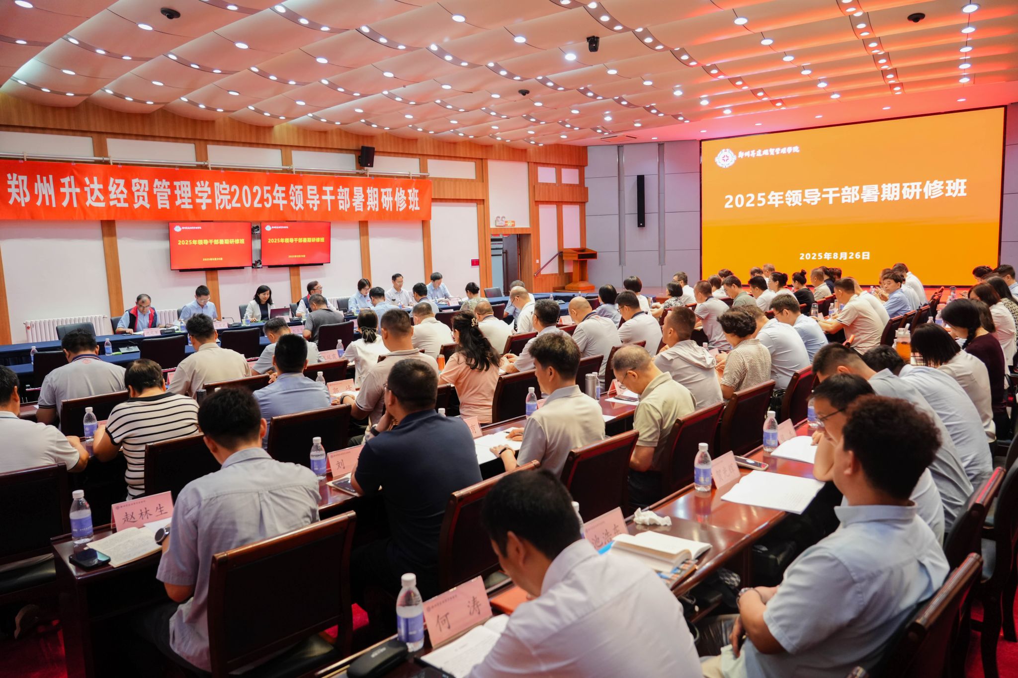 为应对高等教育新阶段民办高校面临的机遇与挑战,全面提升领导干部综合能力,推动学校高质量发展,我校于8月26日开展为期3天的2025年领导干部暑期研修班。董事长王新奇,校长张欣,党委副书记、副校长张金安,党委委员、副校长张其武,登封校区党工委书记沈定军等校领导和七十多位中层干部参加开班仪式。仪式由张欣主持。