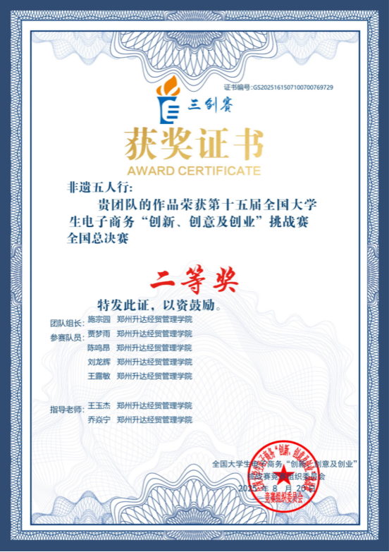 近日,第十五届全国大学生电子商务“创新、创意及创业”挑战赛(以下简称“三创赛”)全国总决赛在贵州人文科技学院顺利落下帷幕。我校管理学院师生组建的“非遗五人行”团队,在全省10631支队伍中脱颖而出,获省赛特等奖,并成功晋级全国总决赛,荣获国赛二等奖,实现我校参与该学科竞赛的新突破。