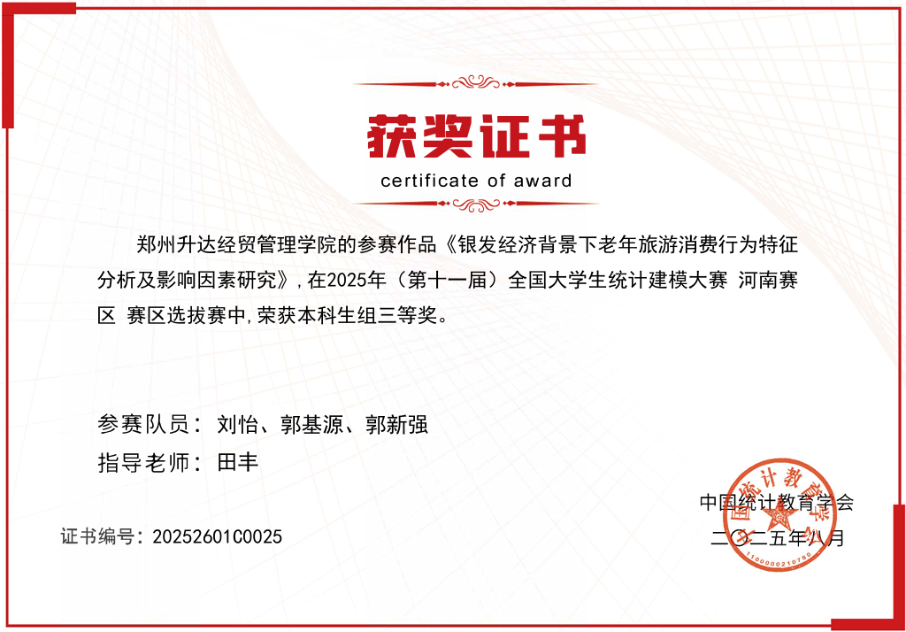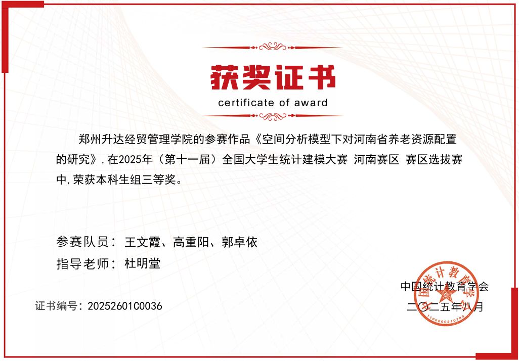 近日,2025年第十一届全国大学生统计建模大赛(以下简称“大赛”)发布获奖结果,通过激烈角逐,管理学院大数据管理与应用专业学子喜获佳绩,荣获河南省本科组三等奖2项,实现在此项赛事零的突破。