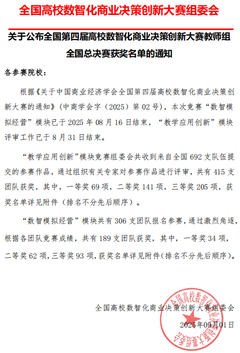 全国第四届高校数智化商业决策创新大赛由中国商业经济学会主办,旨在推动高校数智化教育的发展,提升教师在数智化领域的教学与实践能力。大赛分为“数智模拟经营” 和 “教学应用创新” 两大模块,吸引了来自全国众多高校的教师参与。