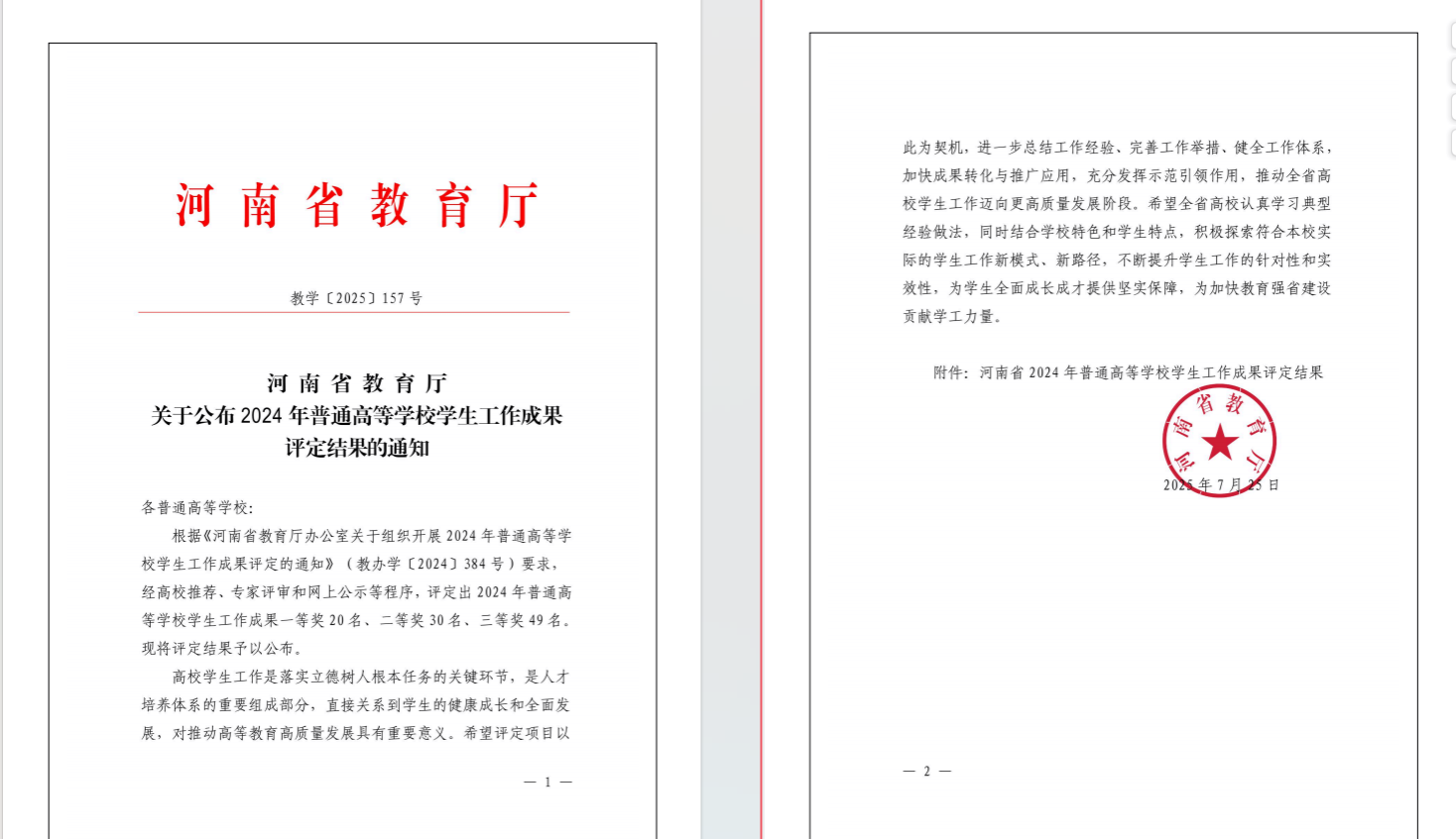 本次评选,由河南省教育厅主办,旨在总结全省高校学生工作的突出成绩,进一步推动高校学生工作内涵式发展。全省高校共上报400余项学生工作项目,经过学校推荐、专家评审、现场答辩和实地考察等环节,最终评选出一二三等奖。