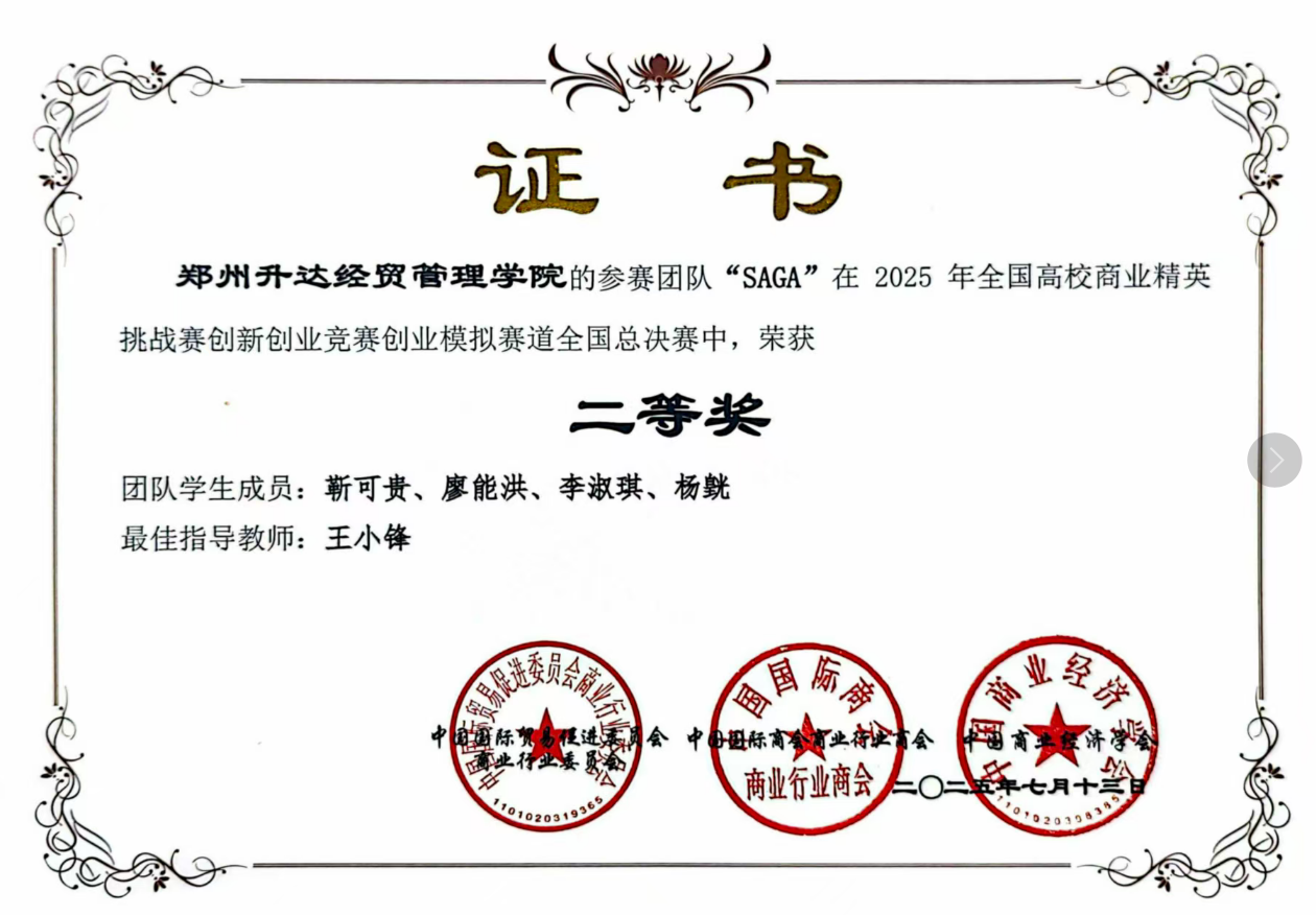 近日,由中国贸促会商业行业委员会、中国国际商会商业行业商会和中国商业经济学会联合主办的2025年全国高校商业精英挑战赛创新创业竞赛创业模拟赛道全国总决赛落下帷幕。在王小锋老师的指导下,由管理学院2023级工商管理专业的靳可贵、廖能洪、李淑琪、杨皝四位同学组成的参赛团队“SAGA”,在全国总决赛中表现优异荣获二等奖。