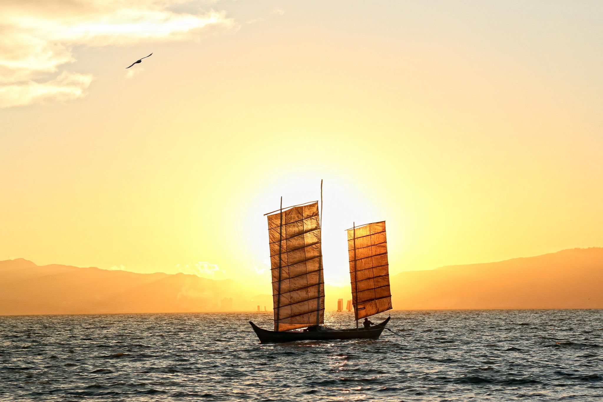 牛爽老师的《渔舟唱晚》(三等奖)定格了开鱼节千帆竞渡的壮美景象。夕阳映照万顷碧波,扬起的白帆如朵朵白云,满载着收获喜悦的渔民缓缓归岸。画面中白帆渡过落日,海鸥翩飞,谱写了一曲渔民劳作后融入自然的和谐乐章,充满了收获的喜悦与宁静的诗意。