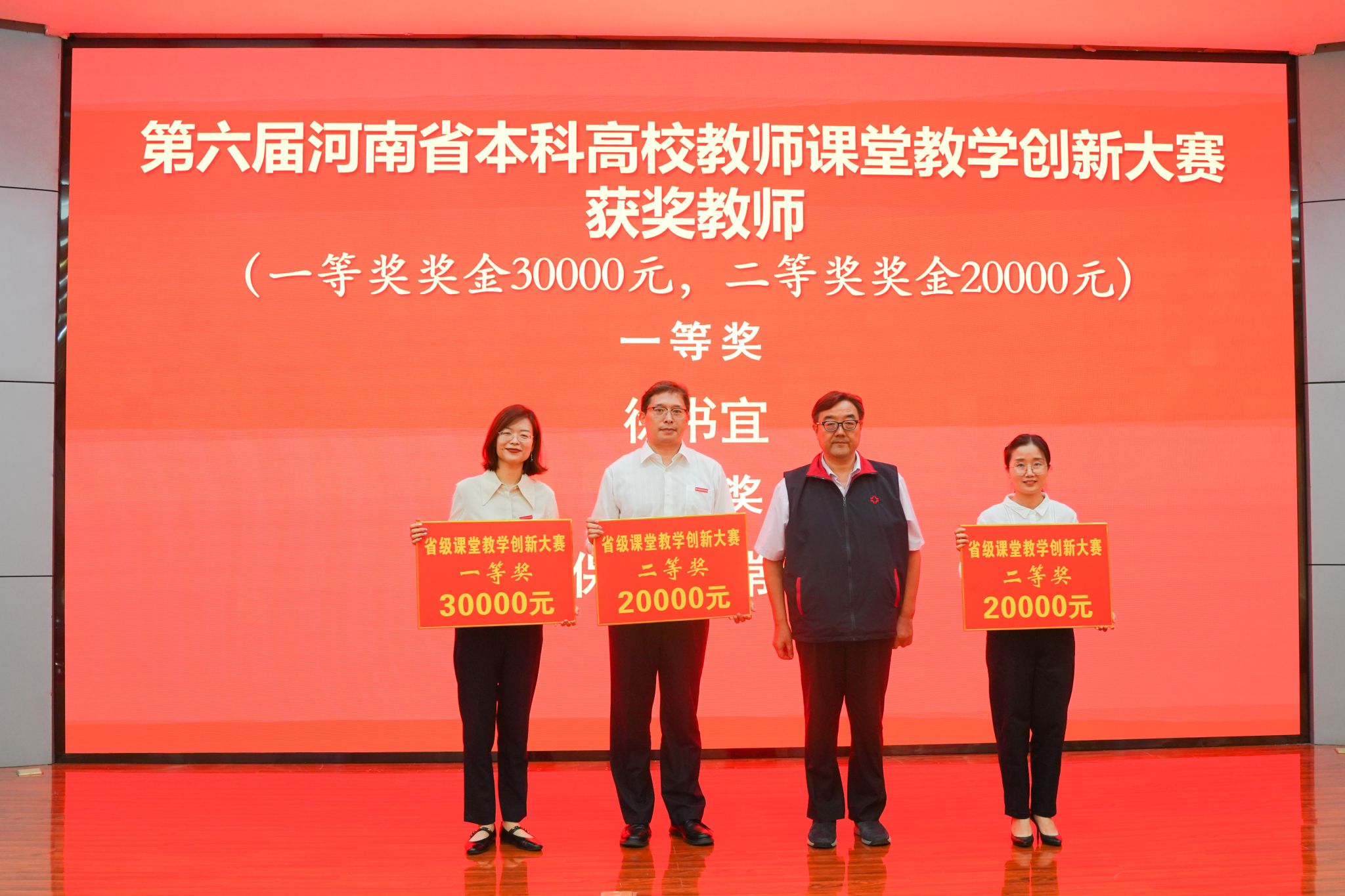 徐书宜作为优秀教师代表发言,分享了她的成长之路、教学成果与心得、畅谈教学体会和参赛收获。她表示今后会继续严格要求自己,一切以大局为重,服从学校的各项安排。与各位同仁携手并肩,坚守教育初心,勇担育人使命,为学校的发展、为河南高等教育事业的进步、为祖国的建设,贡献我们的全部智慧和力量。