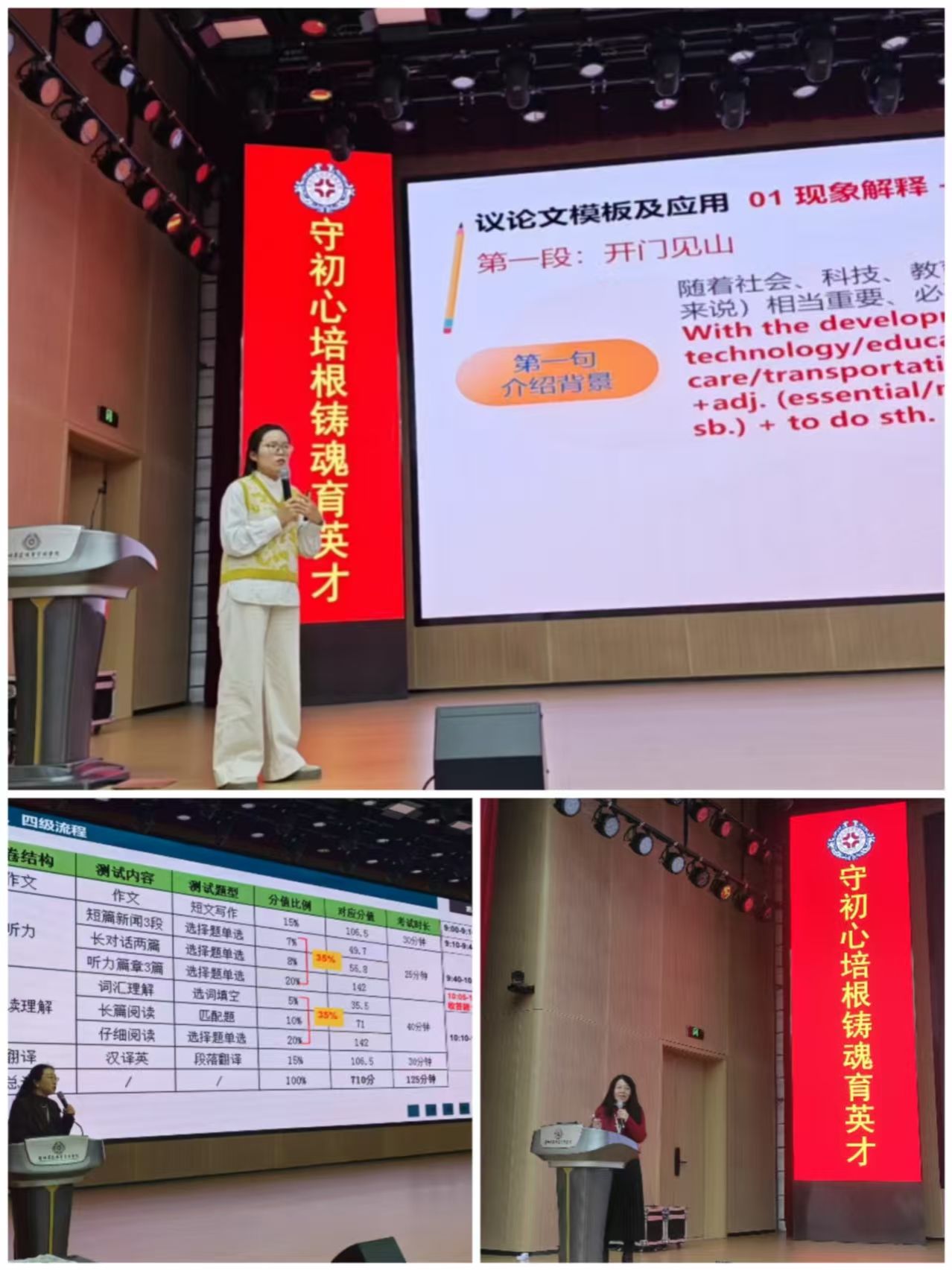 为帮助学生精准突破四级考试难点,外国语学院先后组织十几位教学经验丰富的老师,为学生带来多场四级专题辅导讲座,讲座内容涵盖翻译、阅读、写作等核心模块,系统梳理考点与解题方法,为学生提供全方位的备考支持。系列讲座精准填补学生知识盲区,强化答题策略与实战能力,助力科学规划复习路径,帮助考生提高备考效率与信心。