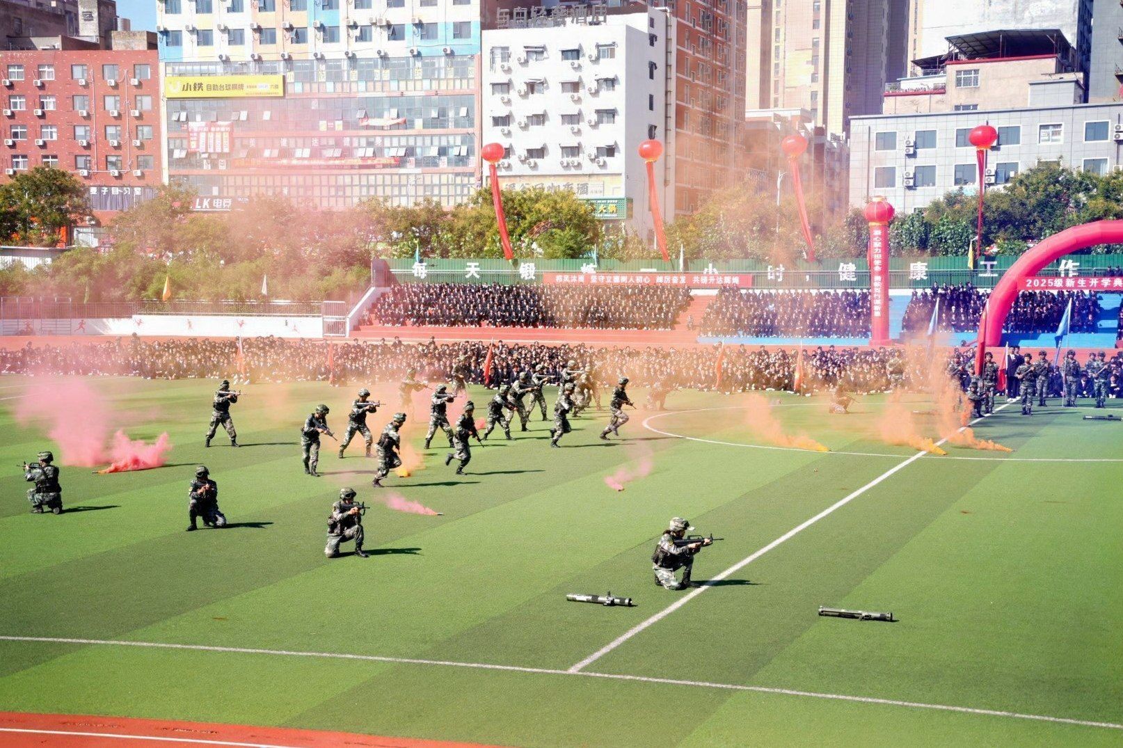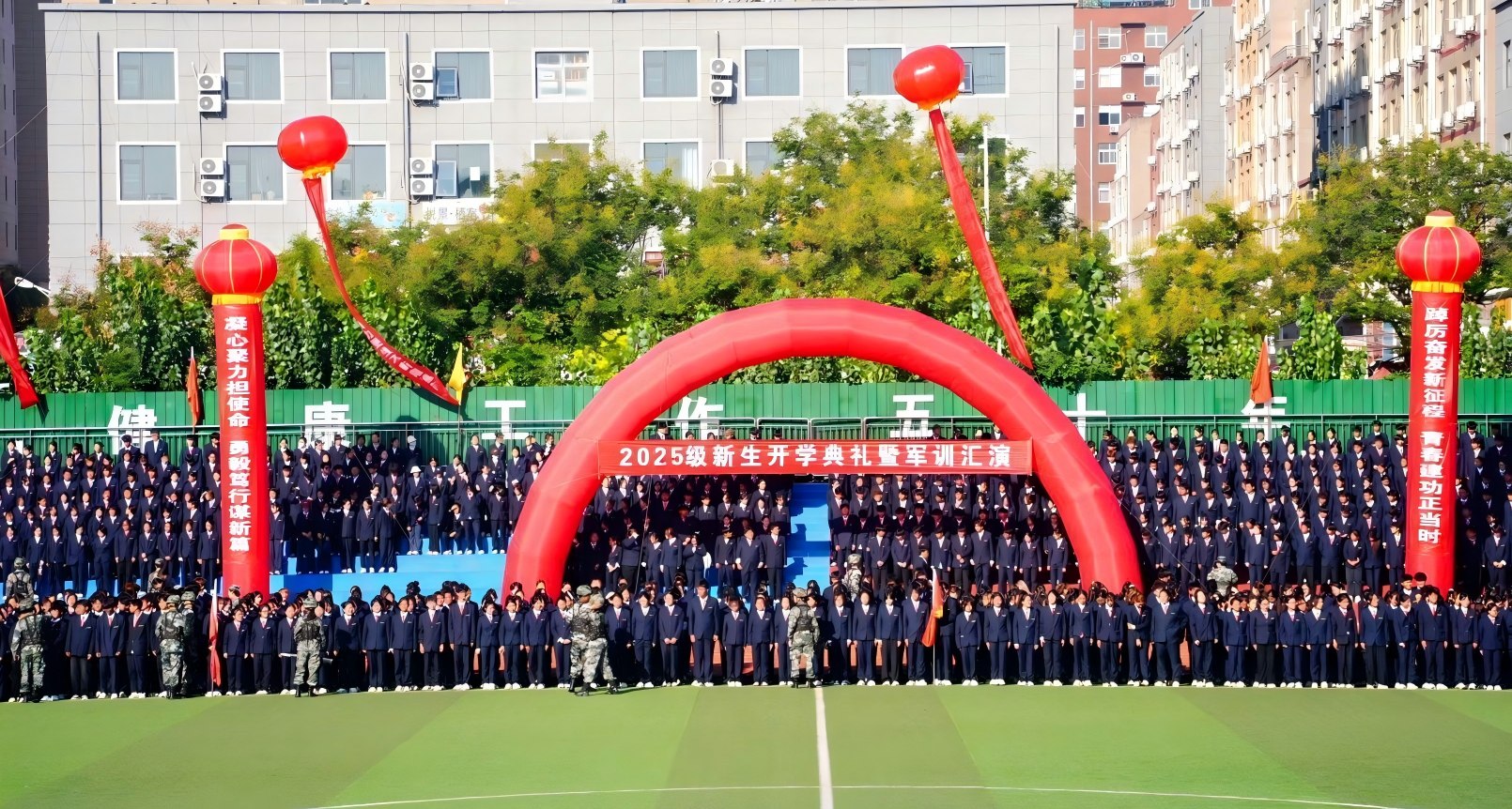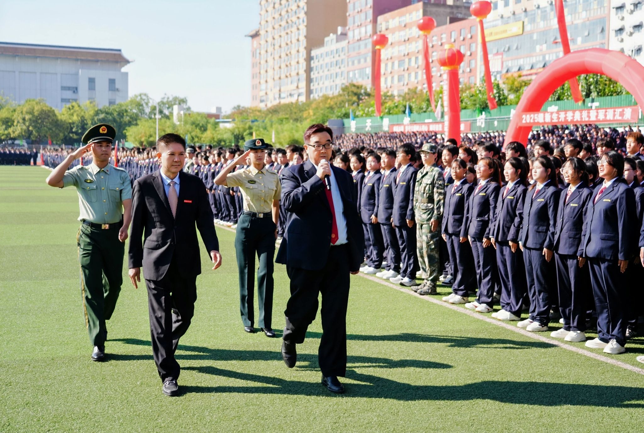 秋风送爽,旌旗飘扬;军歌嘹亮,百炼成钢。9月25日上午,我校2025级新生开学典礼暨军训汇演在体育场隆重举行。经过三周多快节奏、高强度的军训后,全体2025级新生以饱满的精神面貌,威武的军姿、崭新的风貌、昂扬进取的精神意志展现着自己的军训成果,开启了在升达的求学新征程。