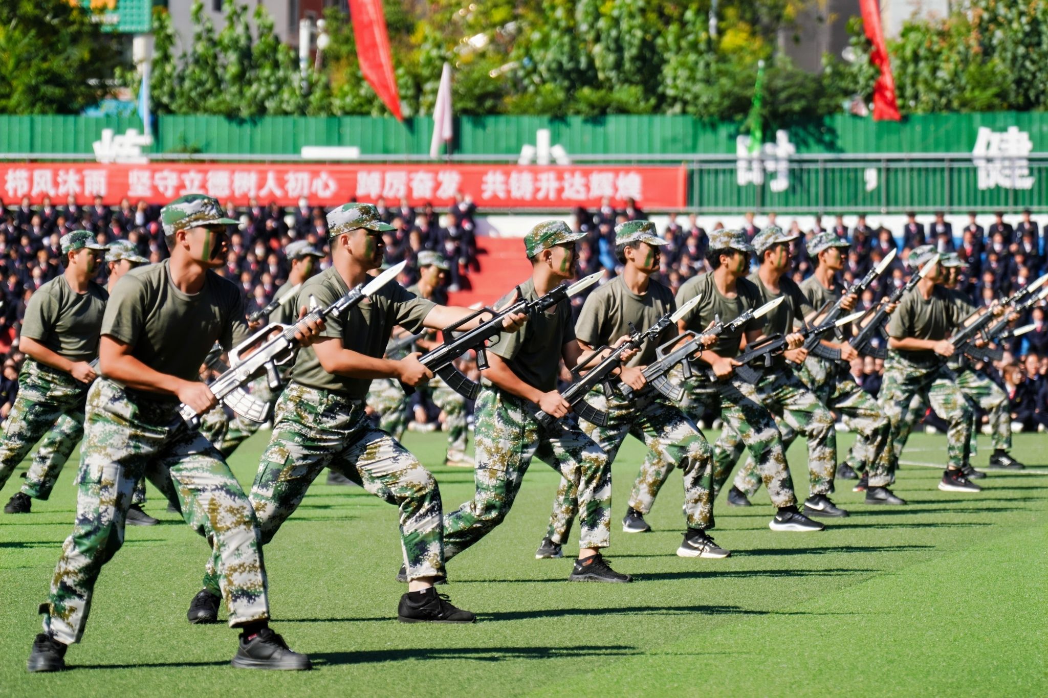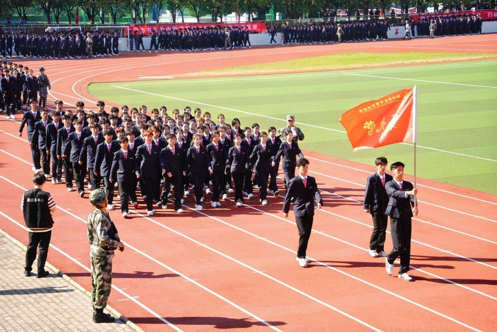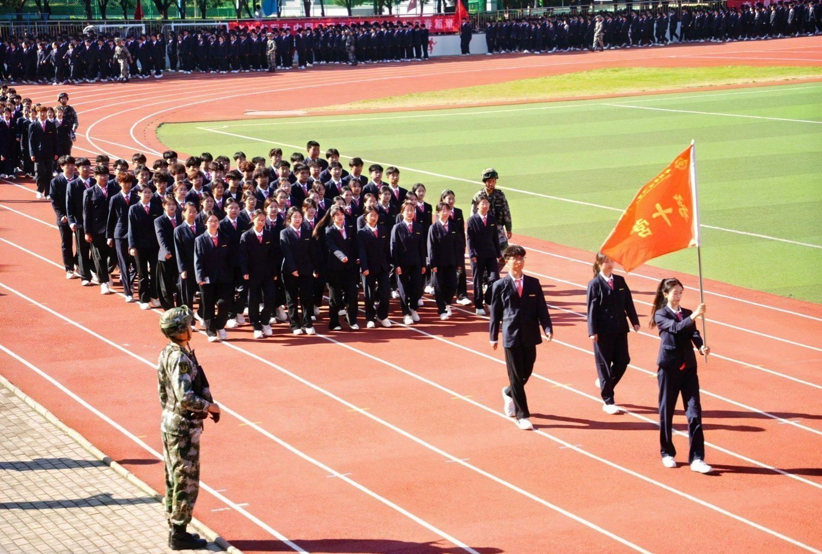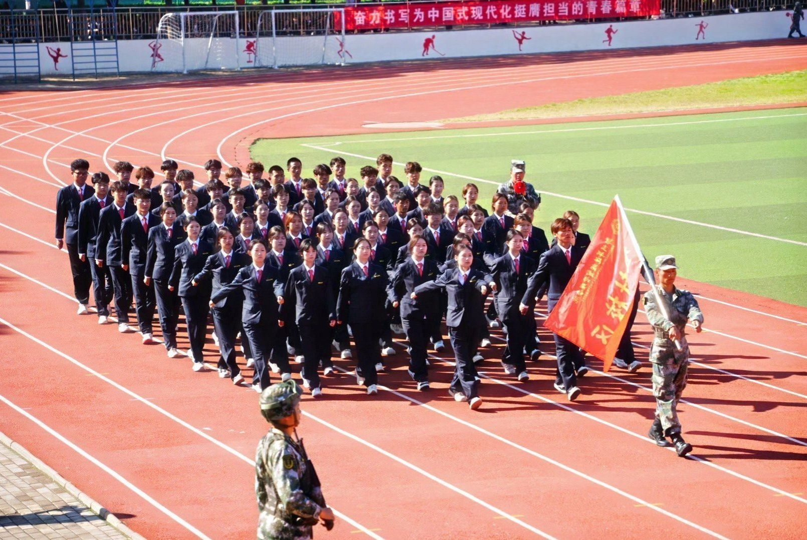接着,在嘹亮的进行曲中,队列式表演开始,全体新生精神抖擞、英姿飒爽地迈着正步走过主席台,展现出新时代青年的蓬勃朝气与坚毅风采。各方阵以挺拔的军姿、激昂的口号、整齐的队列,展现了升达学子斗志昂扬的精神风貌。他们的演示铿锵有力、凌厉有度,充分展示了军训取得的成果,赢得现场阵阵掌声。全体新生还集体背诵了升达校训、升达精神和升达格言。
