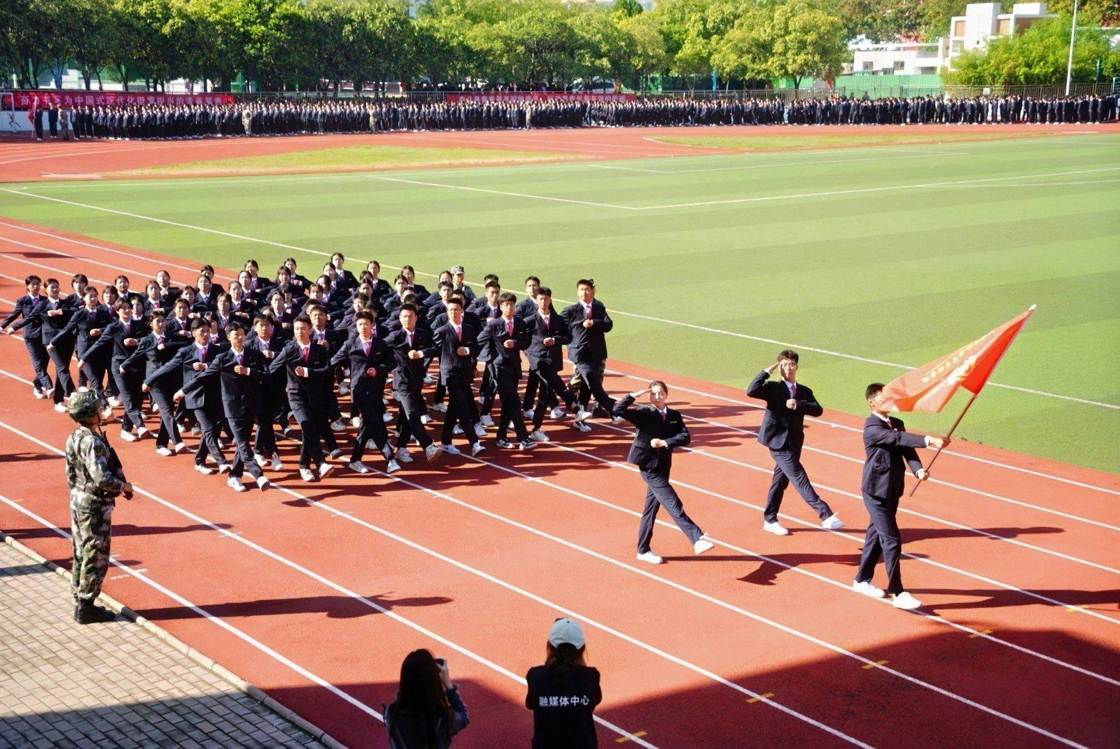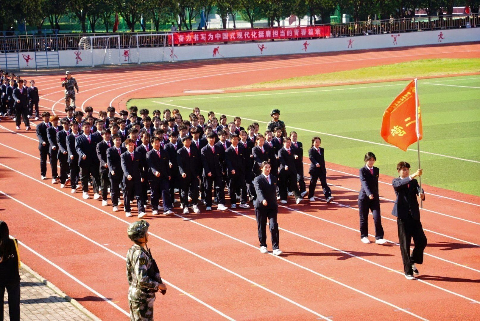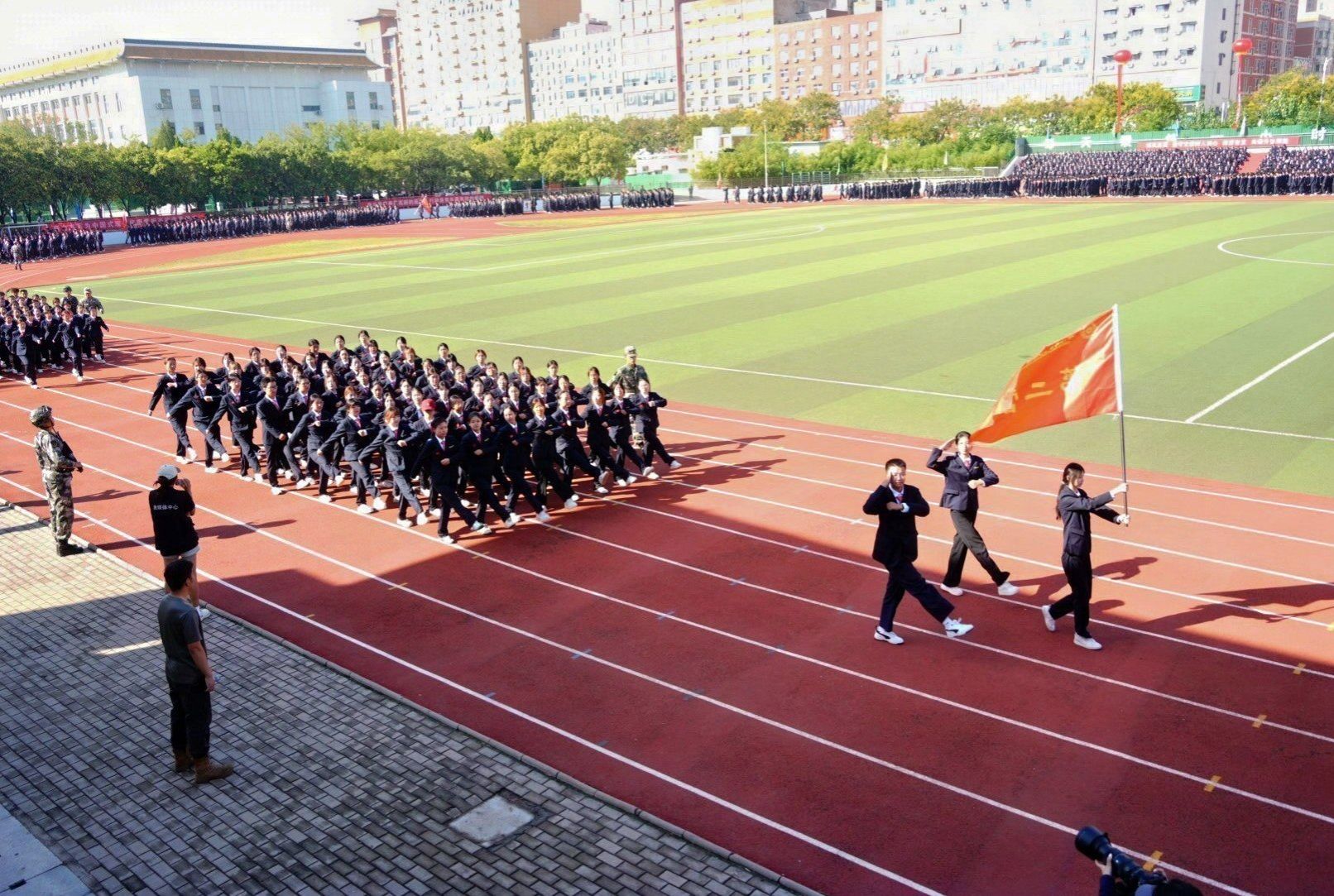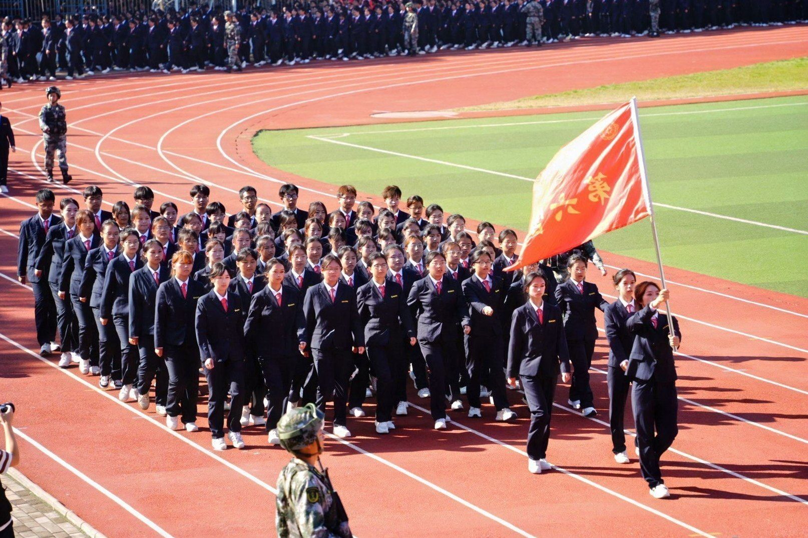 接着,在嘹亮的进行曲中,队列式表演开始,全体新生精神抖擞、英姿飒爽地迈着正步走过主席台,展现出新时代青年的蓬勃朝气与坚毅风采。各方阵以挺拔的军姿、激昂的口号、整齐的队列,展现了升达学子斗志昂扬的精神风貌。他们的演示铿锵有力、凌厉有度,充分展示了军训取得的成果,赢得现场阵阵掌声。全体新生还集体背诵了升达校训、升达精神和升达格言。