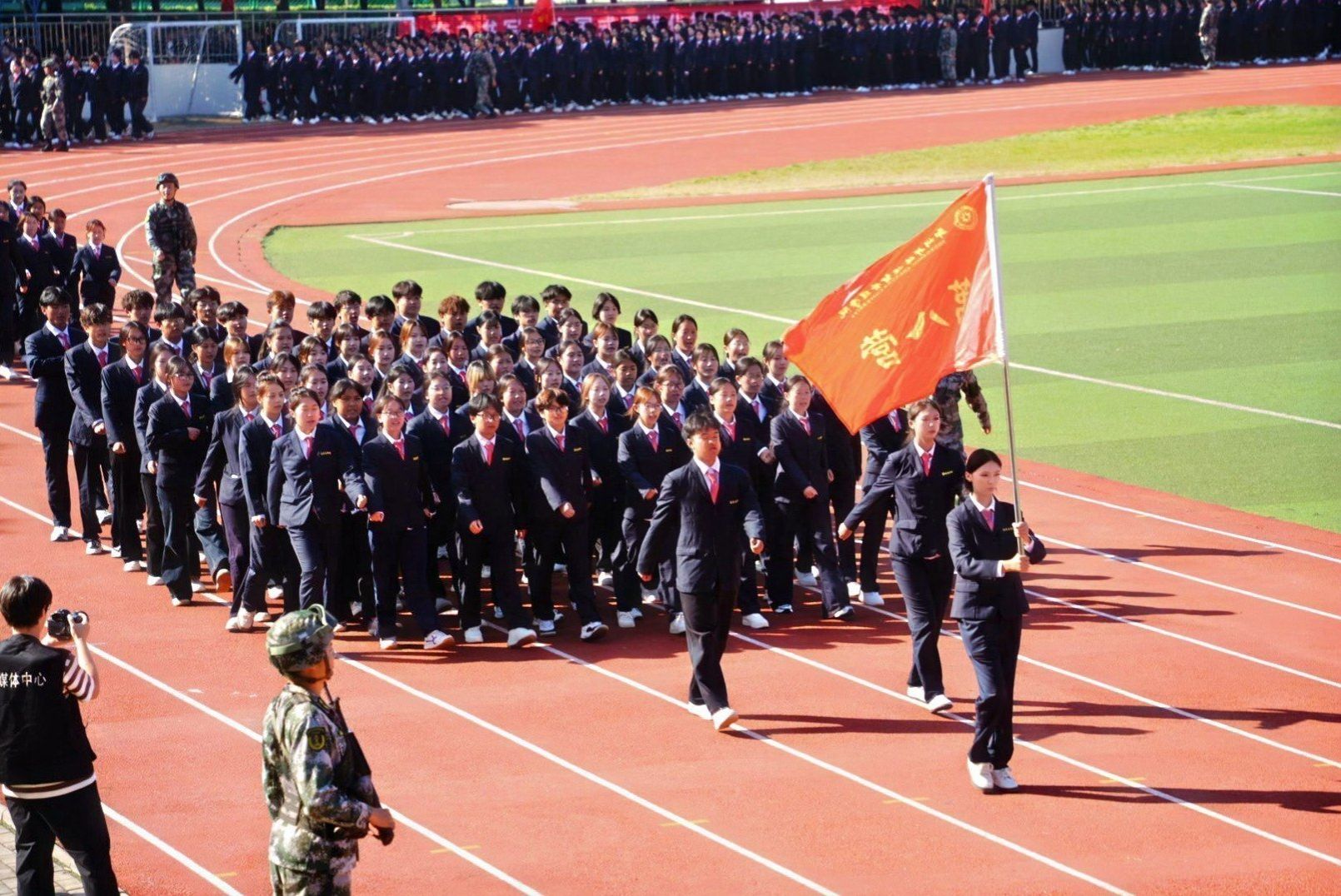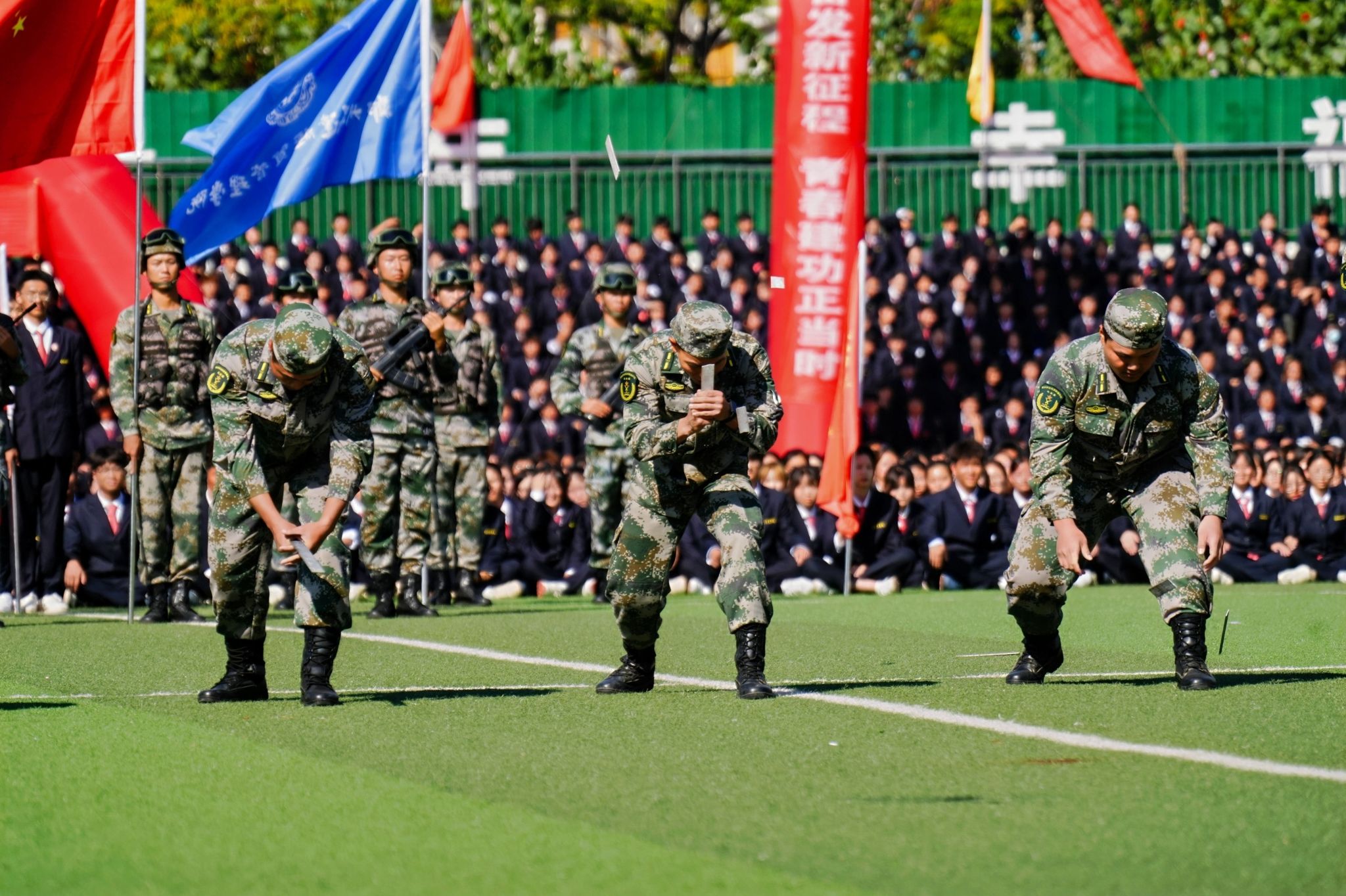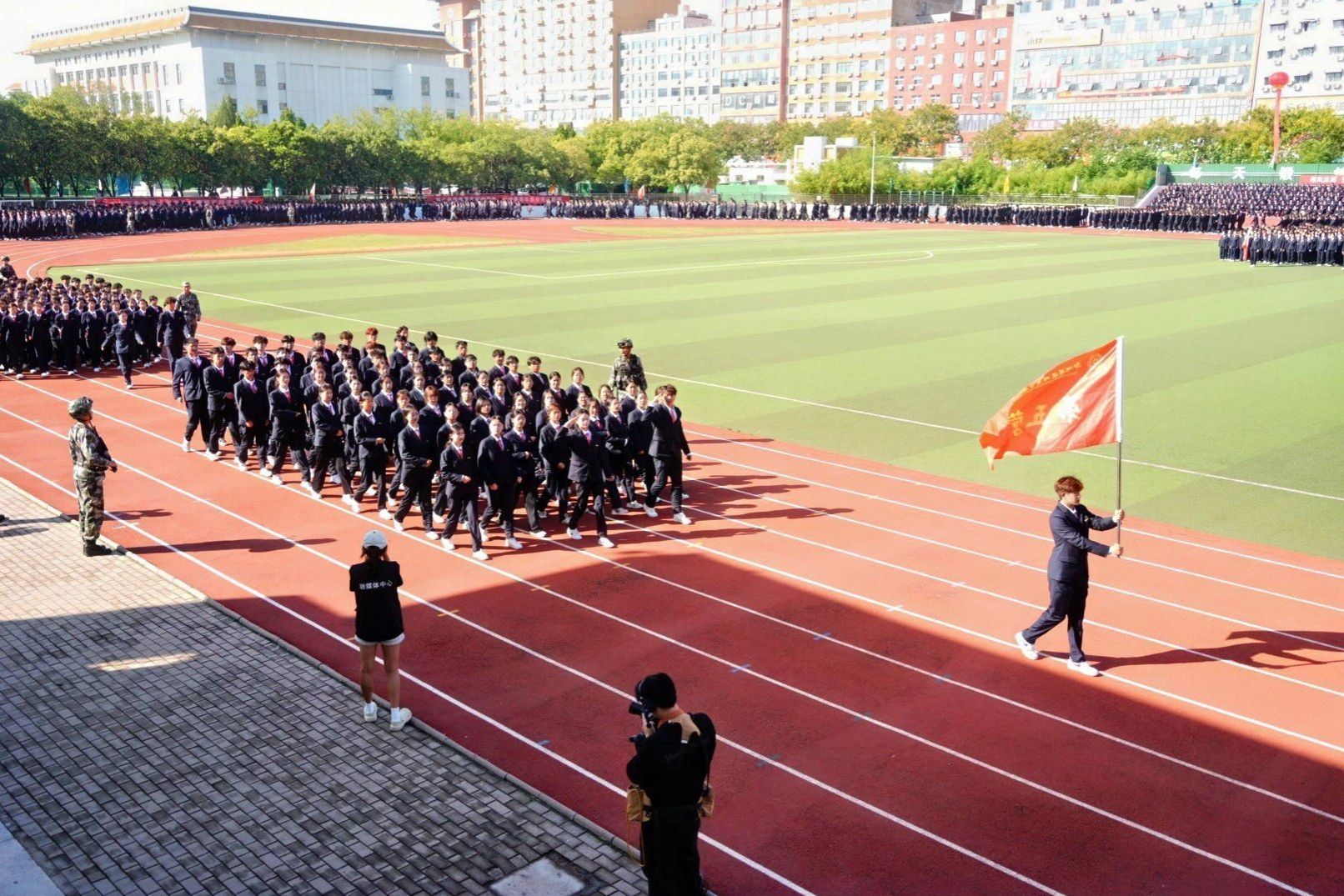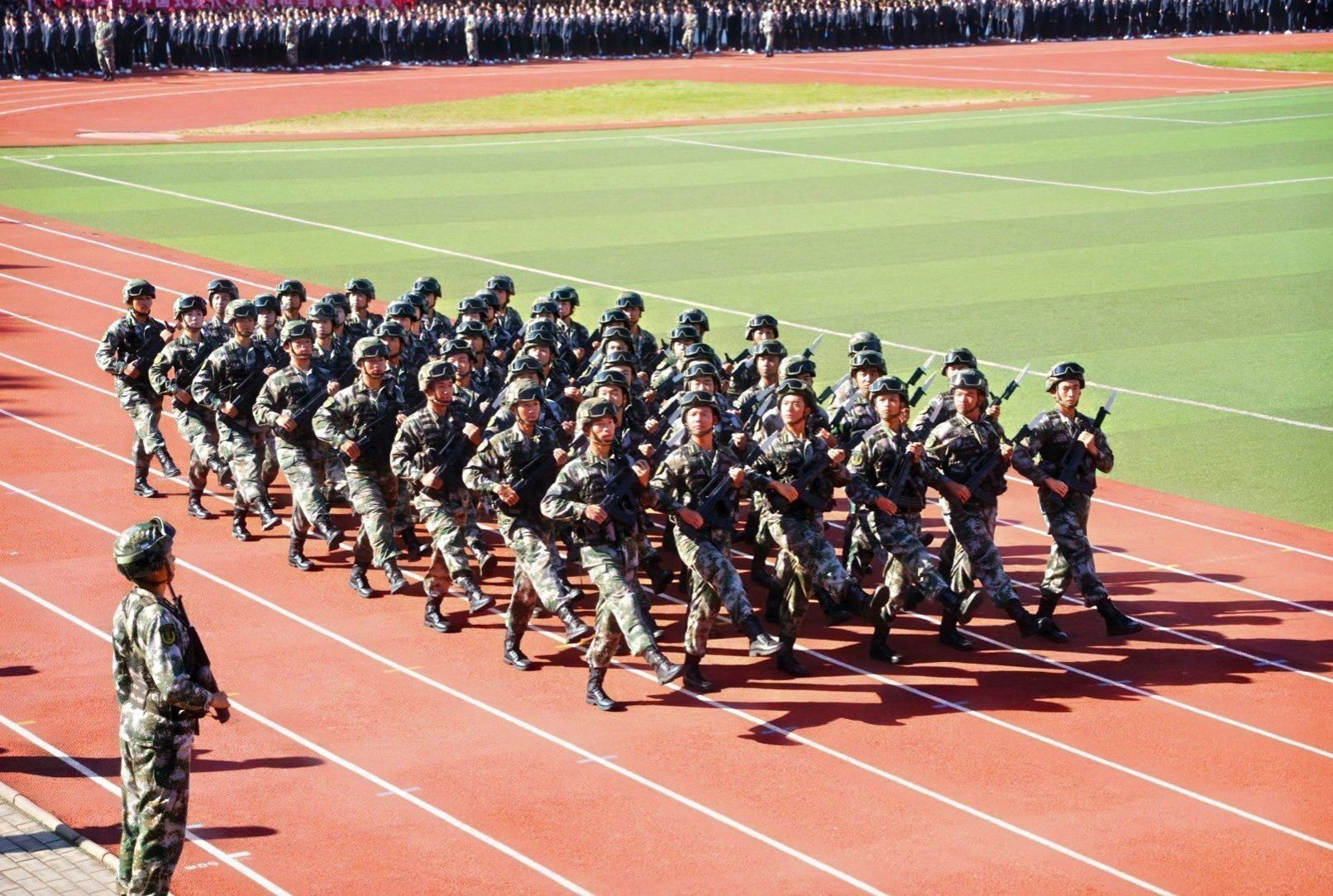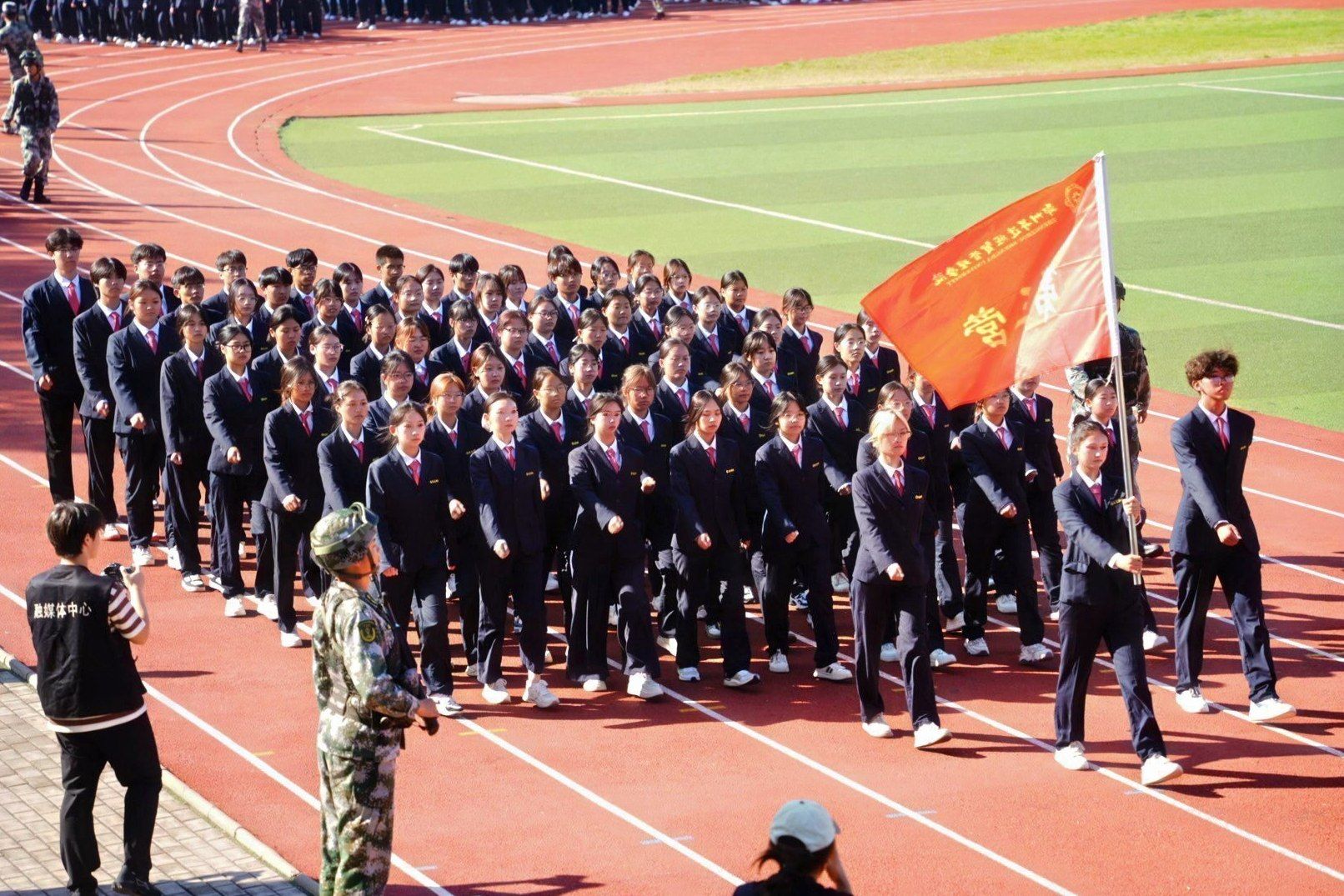 接着,在嘹亮的进行曲中,队列式表演开始,全体新生精神抖擞、英姿飒爽地迈着正步走过主席台,展现出新时代青年的蓬勃朝气与坚毅风采。各方阵以挺拔的军姿、激昂的口号、整齐的队列,展现了升达学子斗志昂扬的精神风貌。他们的演示铿锵有力、凌厉有度,充分展示了军训取得的成果,赢得现场阵阵掌声。全体新生还集体背诵了升达校训、升达精神和升达格言。