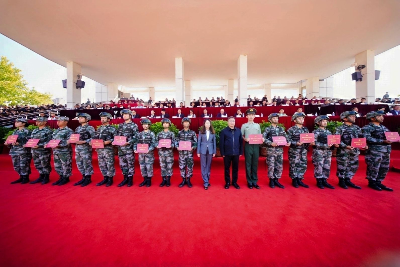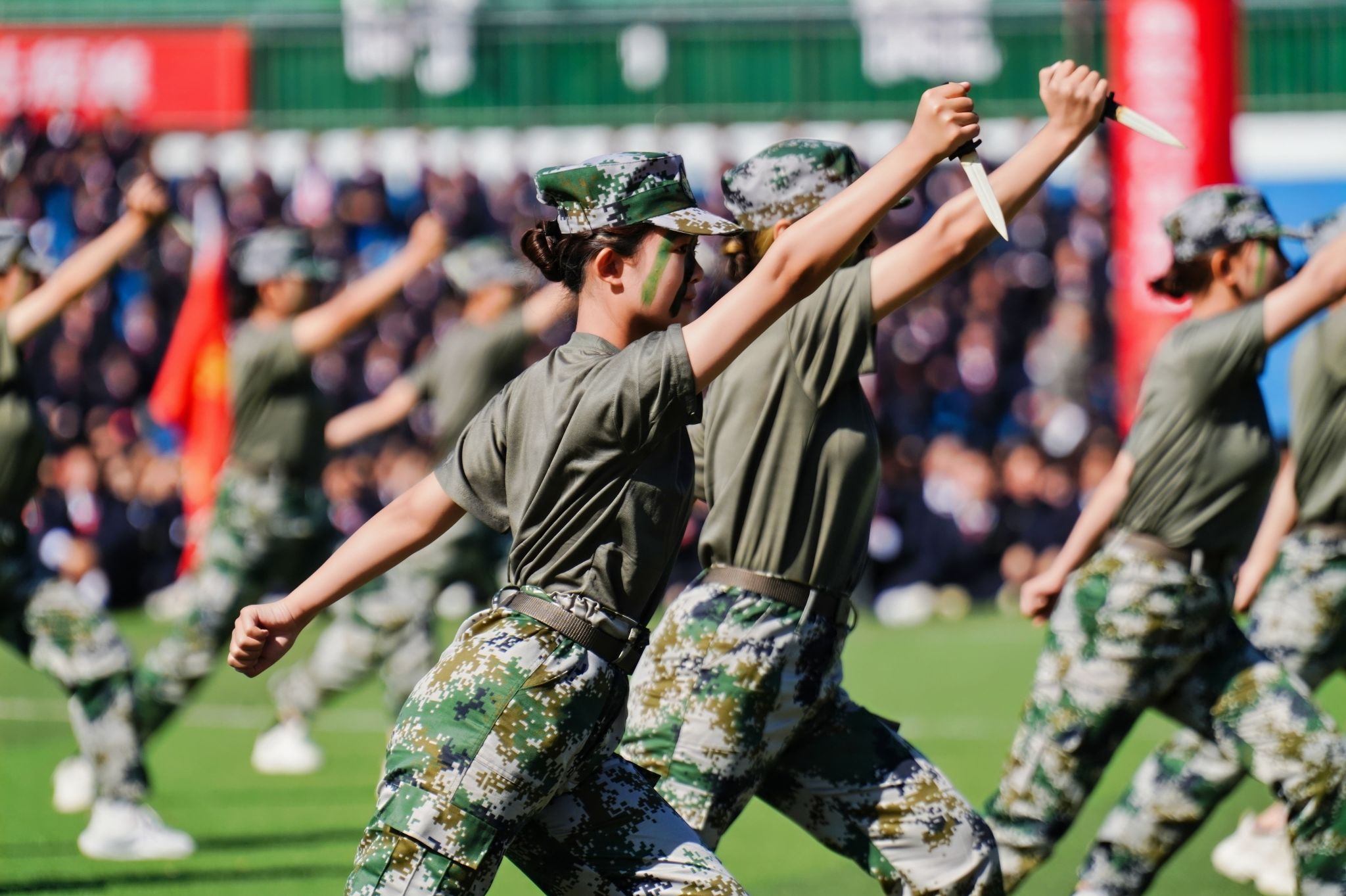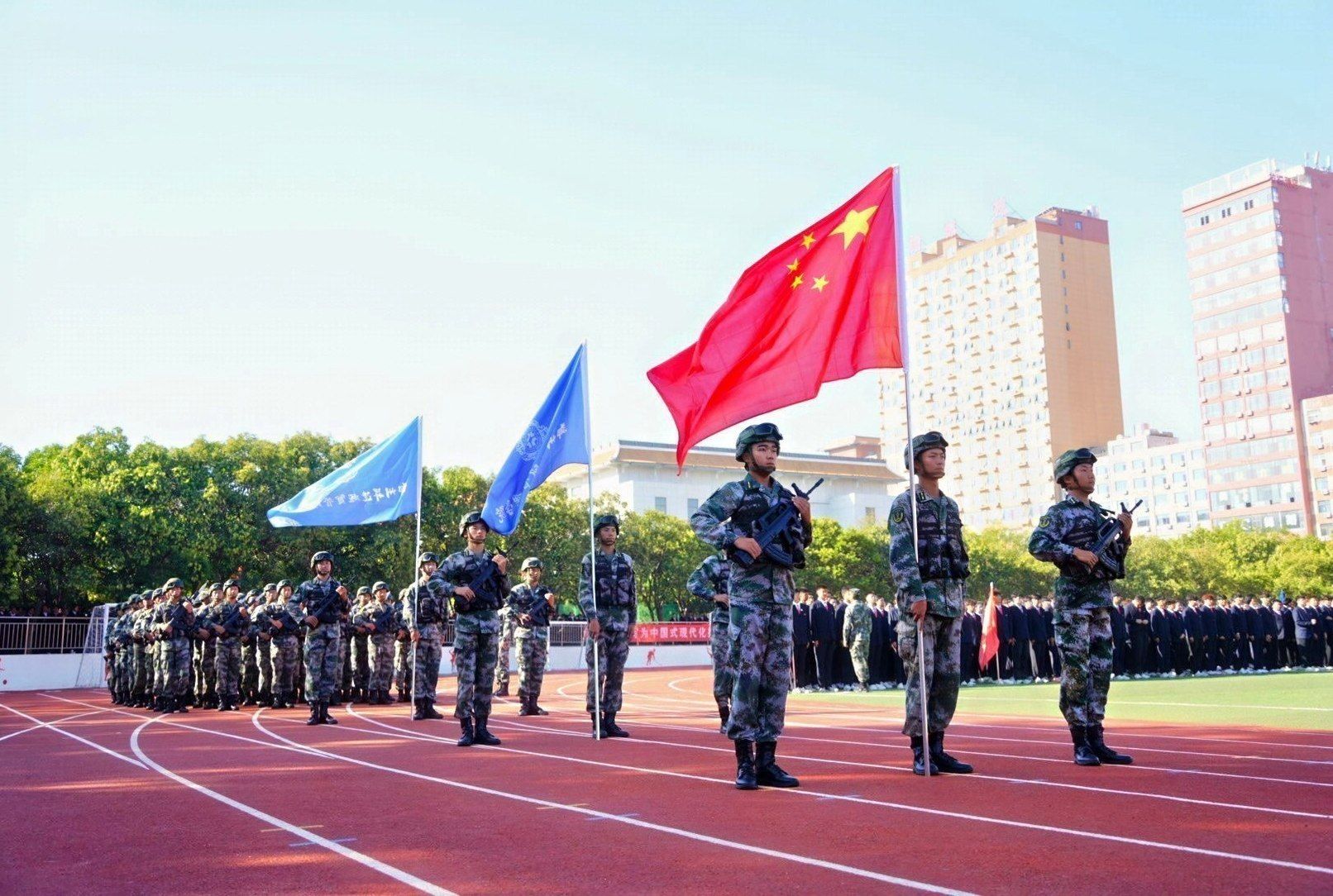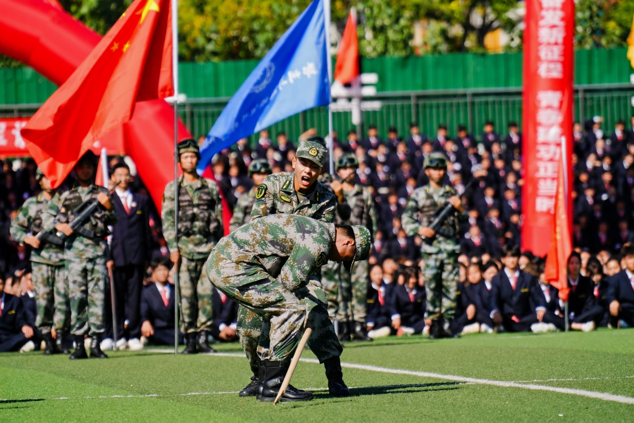 接着,在嘹亮的进行曲中,队列式表演开始,全体新生精神抖擞、英姿飒爽地迈着正步走过主席台,展现出新时代青年的蓬勃朝气与坚毅风采。各方阵以挺拔的军姿、激昂的口号、整齐的队列,展现了升达学子斗志昂扬的精神风貌。他们的演示铿锵有力、凌厉有度,充分展示了军训取得的成果,赢得现场阵阵掌声。全体新生还集体背诵了升达校训、升达精神和升达格言。