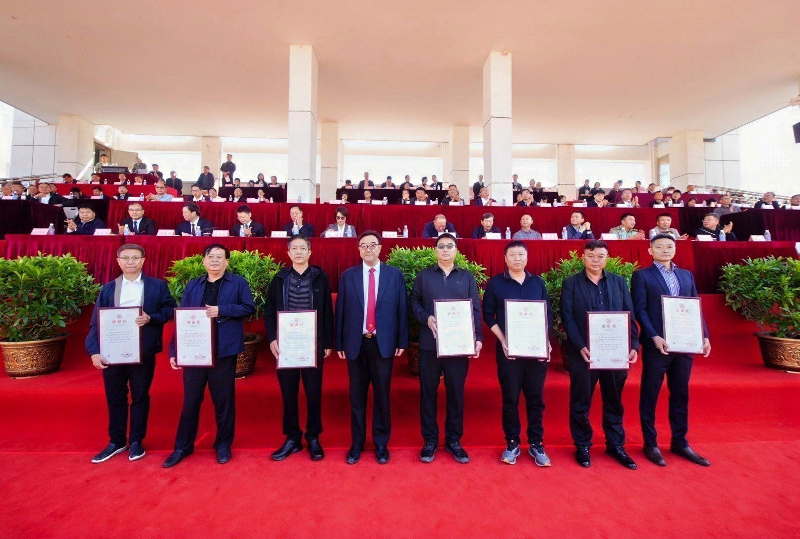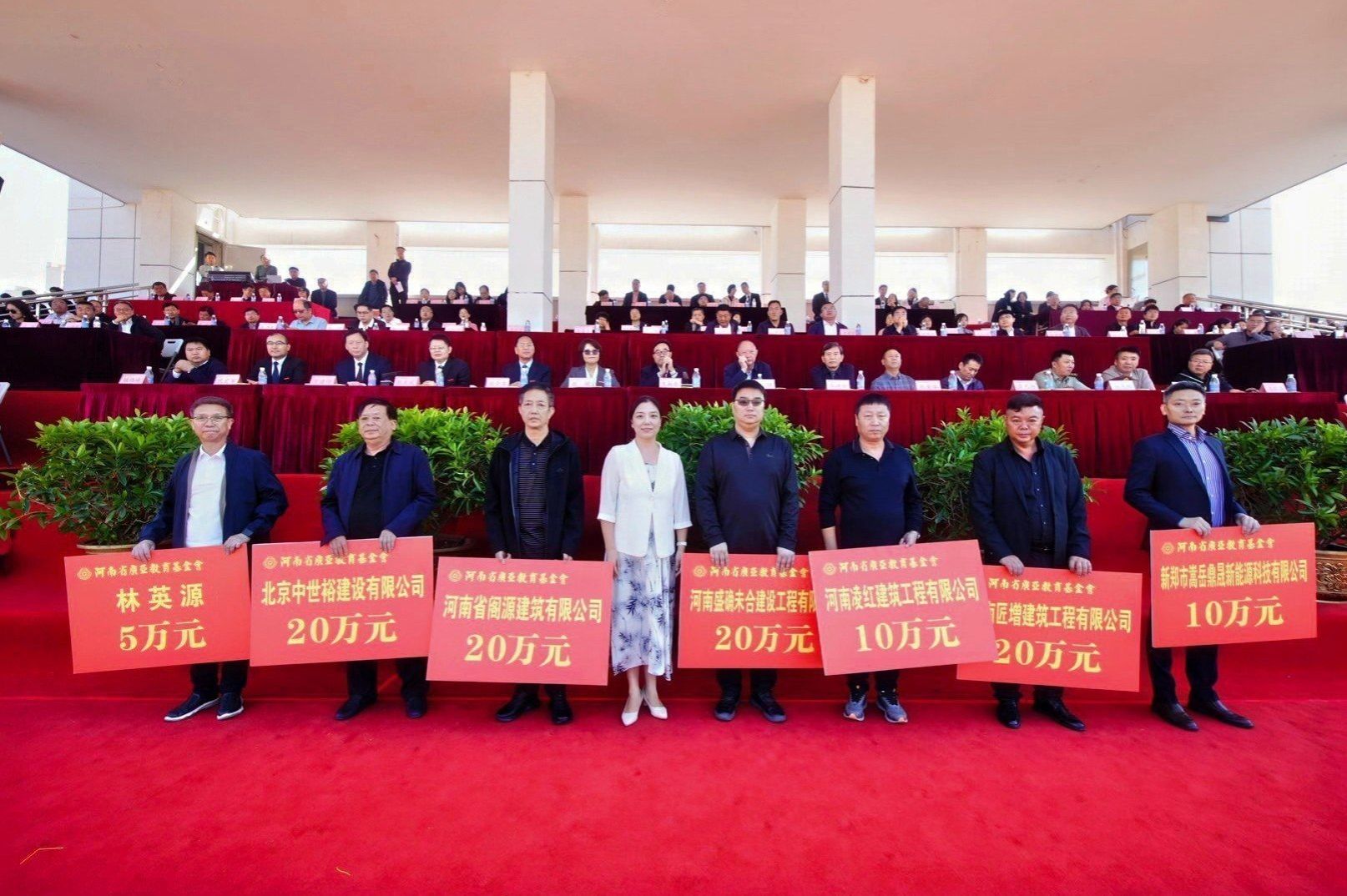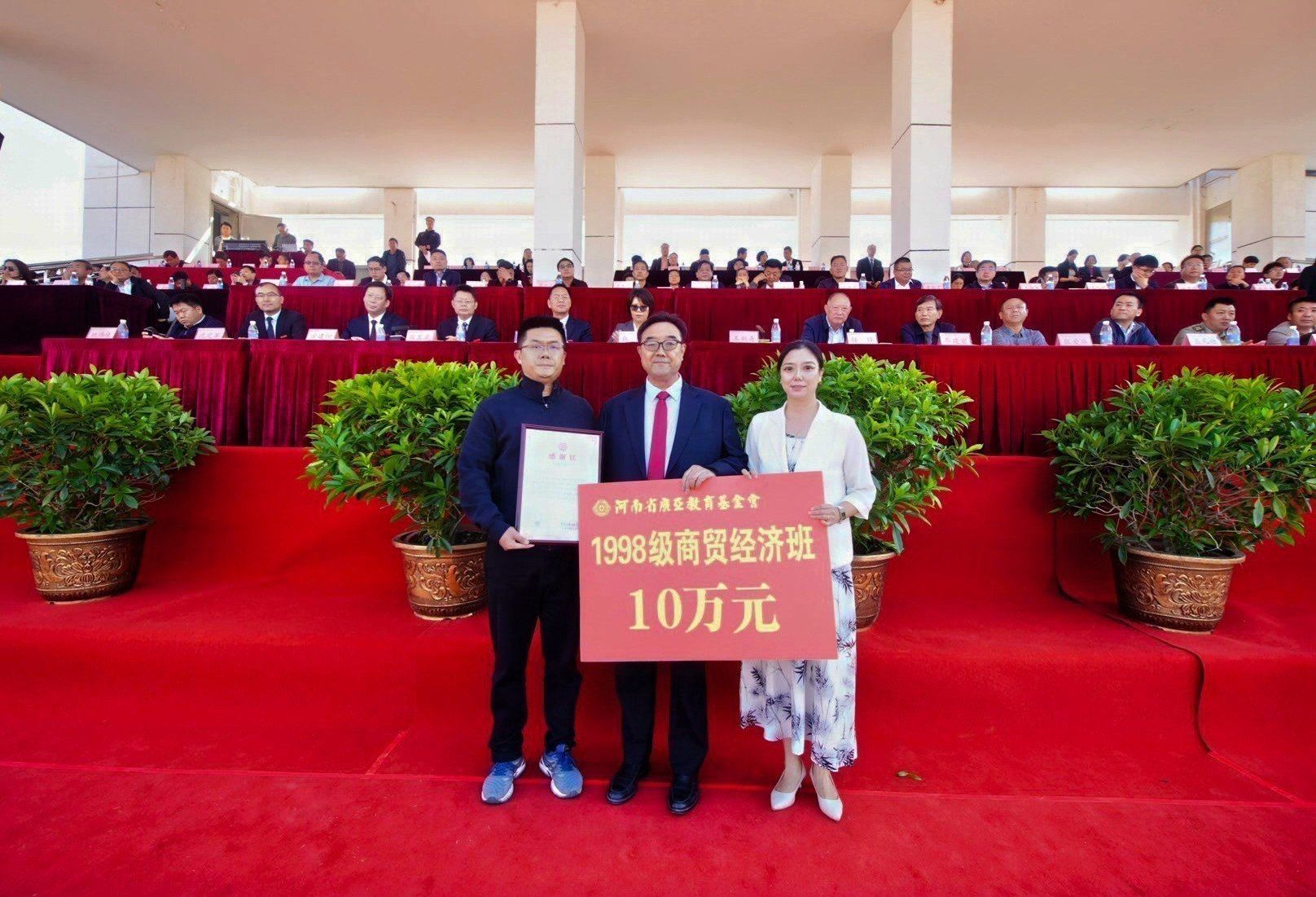郑州市台资企业协会副会长林英源、北京中世裕建设有限公司董事长张龙、河南省阁源建筑有限公司董事长王喜亮、河南盛确未合建设工程有限公司董事长李方方、河南匠增建筑工程有限公司董事长代红建、深圳嵩岳智慧能源有限公司董事长陈宏、河南凌红建筑工程有限公司董事长马红彬、98级商贸经济班代表向广亚教育基金会捐赠,广亚教育基金会理事长秦旻接受捐赠,董事长王新奇为企业代表颁发感谢状,感谢各位企业家和校友对升达教育事业的慷慨解囊与倾心相助。