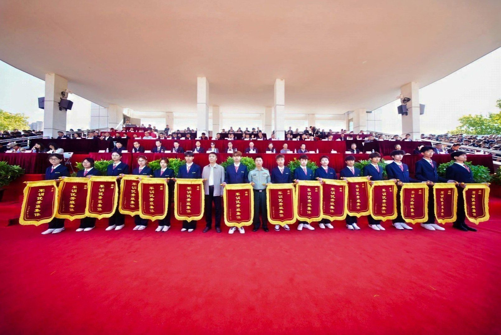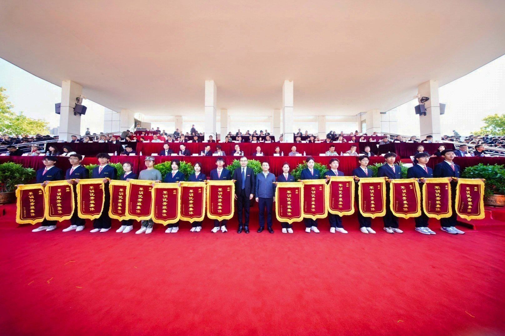 副校长张其武宣布军训优秀学员、优秀教官、先进班集体、优秀辅导员、先进单位名单。参加典礼的贵宾和校领导分别向先进集体与优秀个人颁奖。