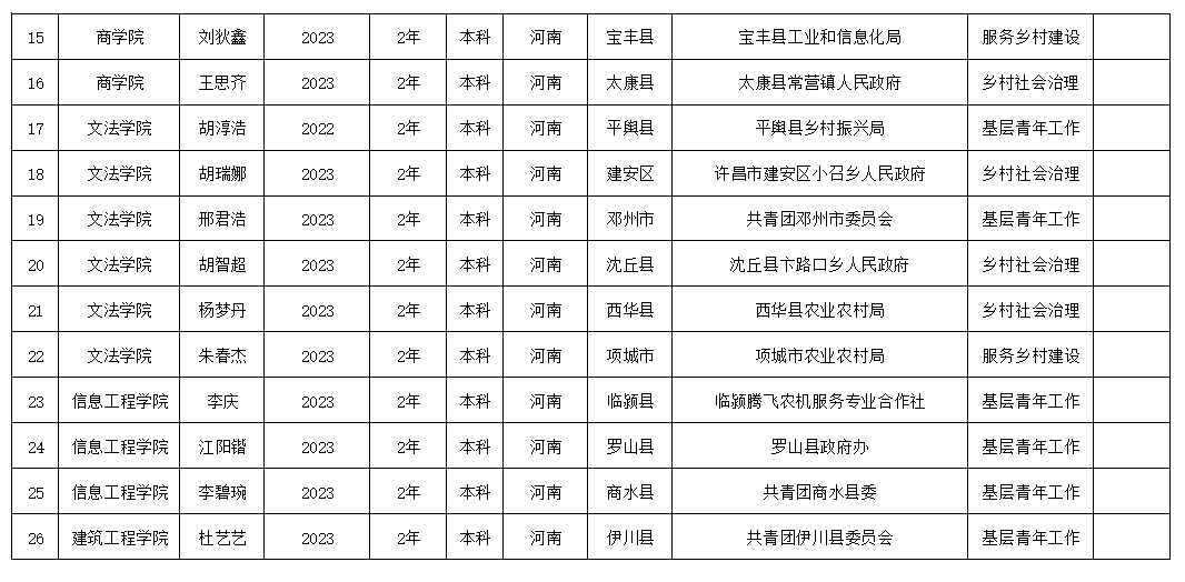 近日,“西部计划”河南省项目办《关于对2026年河南省享受硕士研究生考试优惠政策的大学生志愿服务乡村振兴计划志愿者信息的公示》已发布,我校26名服务乡村振兴计划志愿者入选。