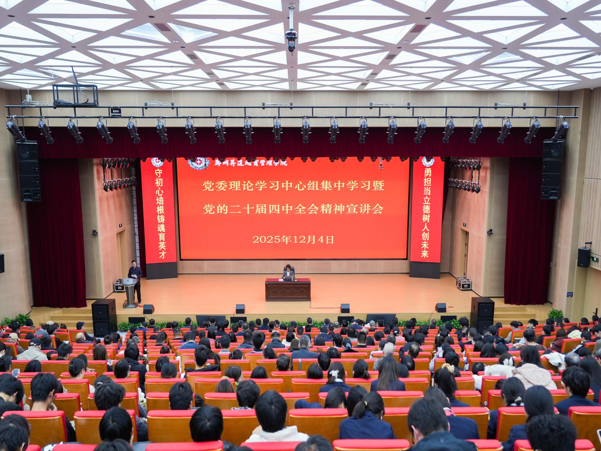 12月4日,在新图书馆第三报告厅召开校党委理论学习中心组(扩大)会,校党委副书记、校长张欣为师生宣讲党的二十届四中全会精神。张欣以《深学笃行党的二十届四中全会精神 为推进中国式现代化贡献更多教育力量》为题,从深刻领会党的二十届四中全会召开的重大意义、准确把握党的二十届四中全会的核心要义和精神实质、细读习近平总书记关于《中共中央关于制定国民经济和社会发展第十五个五年规划的建议》的说明、推动党的二十届四中全会精神落地见效等四个方面,对党的二十届四中全会提出的新思想、新论断、新要求进行了全面、深入、系统地解读。