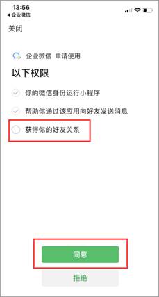4.取消“获得你的好友关系”选项,点击“同意”按钮。