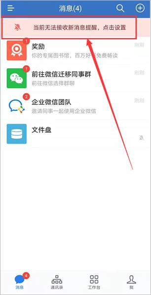 8.加入企业微信后,假如提示“当前无法接收新消息提醒,点击设置”,请务必根据提示设置接收新消息提醒,避免错过企业微信相关重要通知。