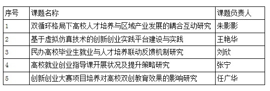 根据《河南省教育厅办公室关于做好2022年全省大中专院校就业创业课题研究工作的通知》(教办学〔2022〕397号)文件精神,我校组织了2022年全省大中专院校就业创业课题申报遴选工作,经各学院申报,专家组评审,拟推荐《双循环格局下高校人才培养与区域产业发展的耦合互动研究》等5个项目申报2022年全省大中专院校就业创业课题,现予以公示,排名不分先后,具体见下表: