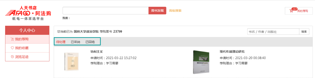 3、我的荐购:【个人中心】→【我的荐购】 中可查看到所有的荐购书目