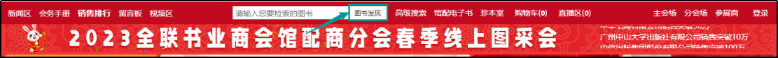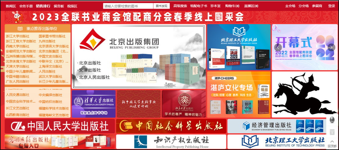 1、主会场:其右上角展示图书采会开幕式领导讲话及平台消息发布。其他板块主要展示重点出版社书目,直接点击出版社名称即可进入选书界面。