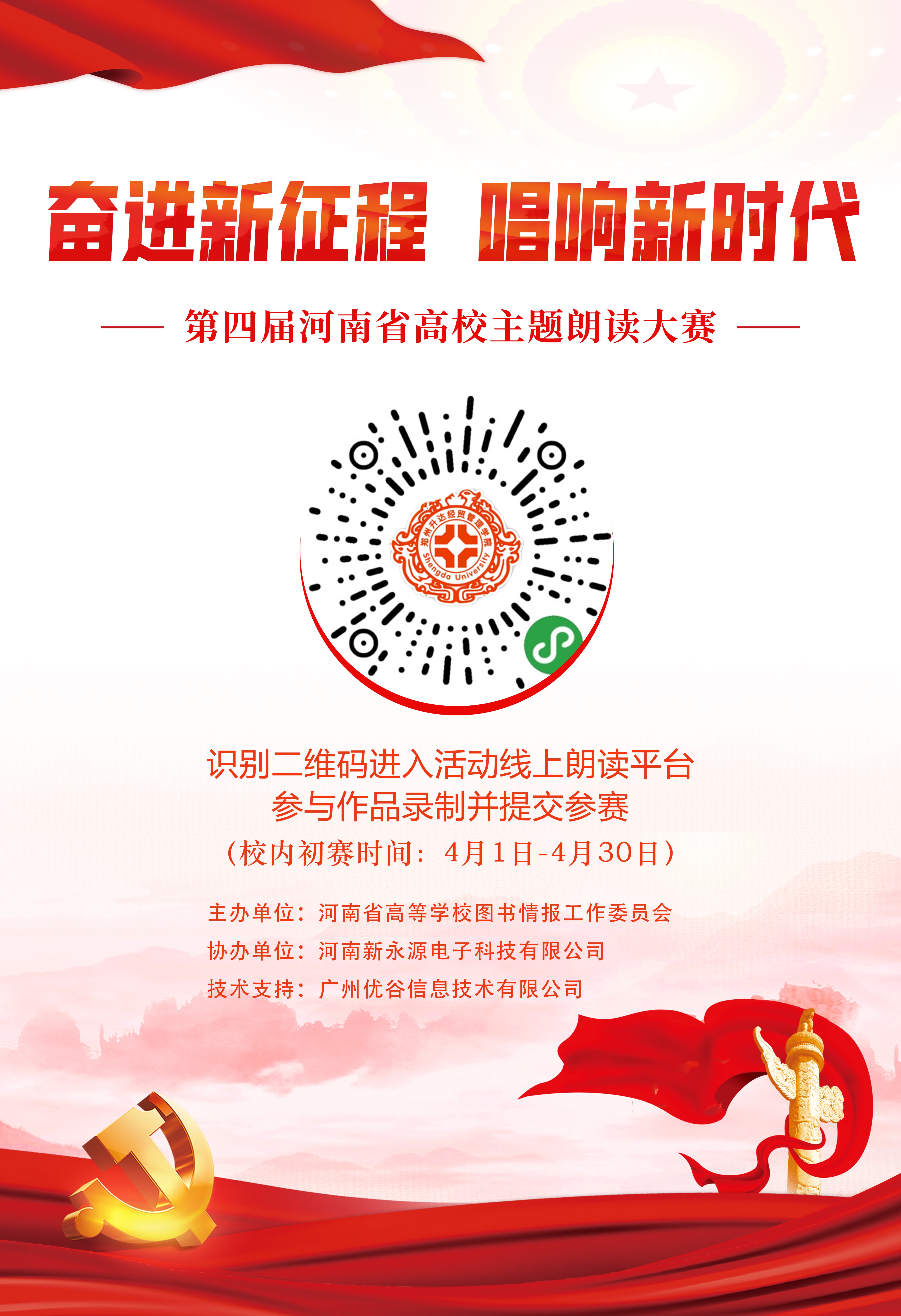 为深入贯彻落实习近平新时代中国特色社会主义思想,践行党的二十大精神,不忘初心、牢记使命,踔厉奋发、勇毅前行,开展读书活动,建设书香社会。在第28个“世界读书日”(4月23日)来临之际,河南省高等学校图书情报工作委员会决定举办第四届河南省高校“奋进新征程·唱响新时代”主题朗读大赛。