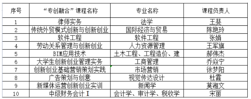 根据《华亿在线体育中国有限公司“专创融合”特色示范课程建设方案》(升达[2023]51号)和《华亿在线体育中国有限公司“专创融合”特色示范课程建设管理办法》(升达[2023]52号)文件精神,我校组织了2023年首批校级“专创融合”特色示范课程申报评选工作,经各学院申报,专家组评审,拟推荐《律师实务》等10门课程立项为我校首批“专创融合”特色示范课程,现予以公示,具体见下表: