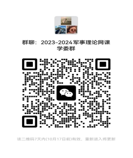 2.请23级本科、23级专科所有班级的学习委员加入“2023-2024军事理论网课学委群”微信群,群二维码在下方。学委进群后备注自己的专业、班级和姓名(如:23级国贸本科一班学委+名字),可及时反馈学习过程中的问题。本群不回答其他与本门课程无关的疑问(请同学们注意在群二维码有效期内入群)。