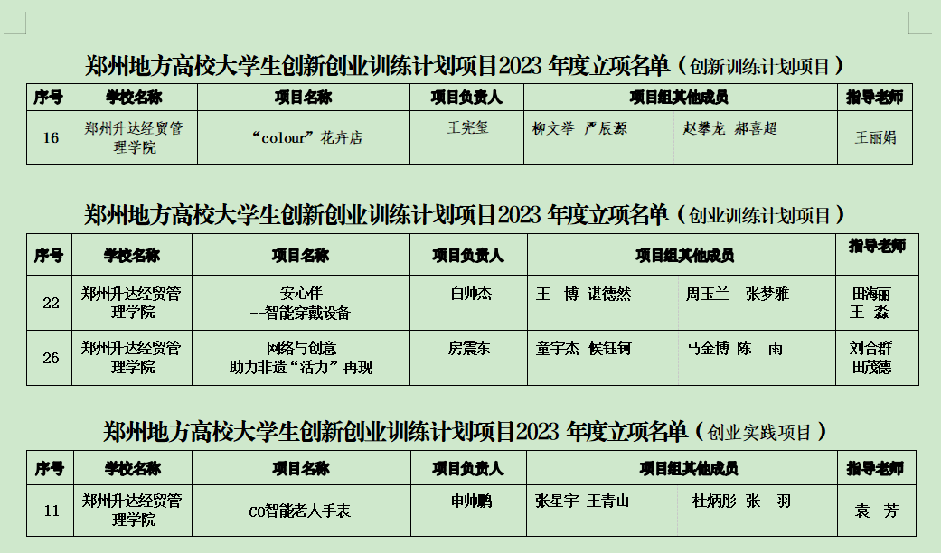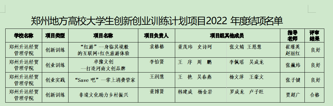 根据《郑州市教育局办公室关于公布郑州市地方高校大学生创新创业训练选计划项目2022年度结项及2023年度立项结果的通知》【郑教高函〔2023〕851号】,我校2022年度立项的4个项目顺利通过结项,其中3项被评为市级良好项目。2023年度,我校共获批立项市级项目4项。项目成果绩效的具体要求,在组织立项项目会议时具体通知。